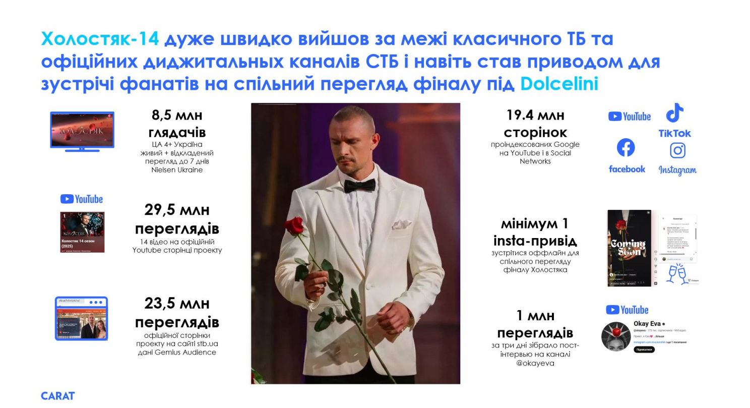 Але і це не все. Творче коло зібрало бажаючих для спільного, затишного, офлайн перегляду в Києві на вечерю під келих Dolcelini. Цей факт є дуже важливим, одним із найсильніших індикаторів attention power і cultural relevance шоу, що може бути основою нових можливостей для брендів вбудовуватися не лише в інформаційний простір проєкту, але й стати частиною метареальності у фізичному світі аудиторії Холостяка. Шоу перестає бути медіаконтентом. Воно стає платформою соціального досвіду. Тому бренди можуть не просто купити розміщення, а й стати частиною досвіду, емоцій і ритуалів, які глядач проживає у цій метареальності.