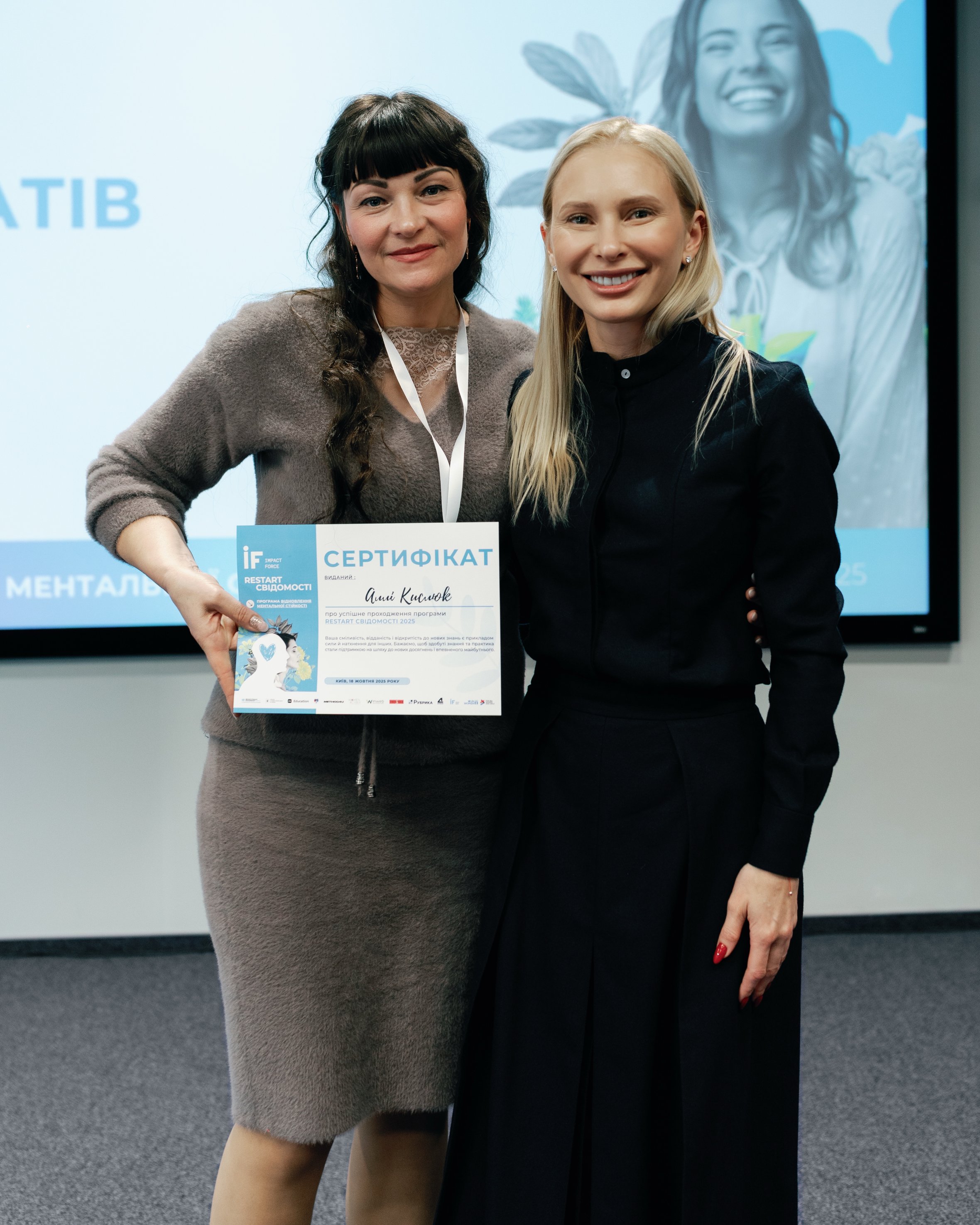 Вручення сертифіката Аллі Кислюк, учасниці програми, Ольгою Дьяковою, співзасновницею Impact Force, на фінальній події програми “ReStart Свідомості 2025”