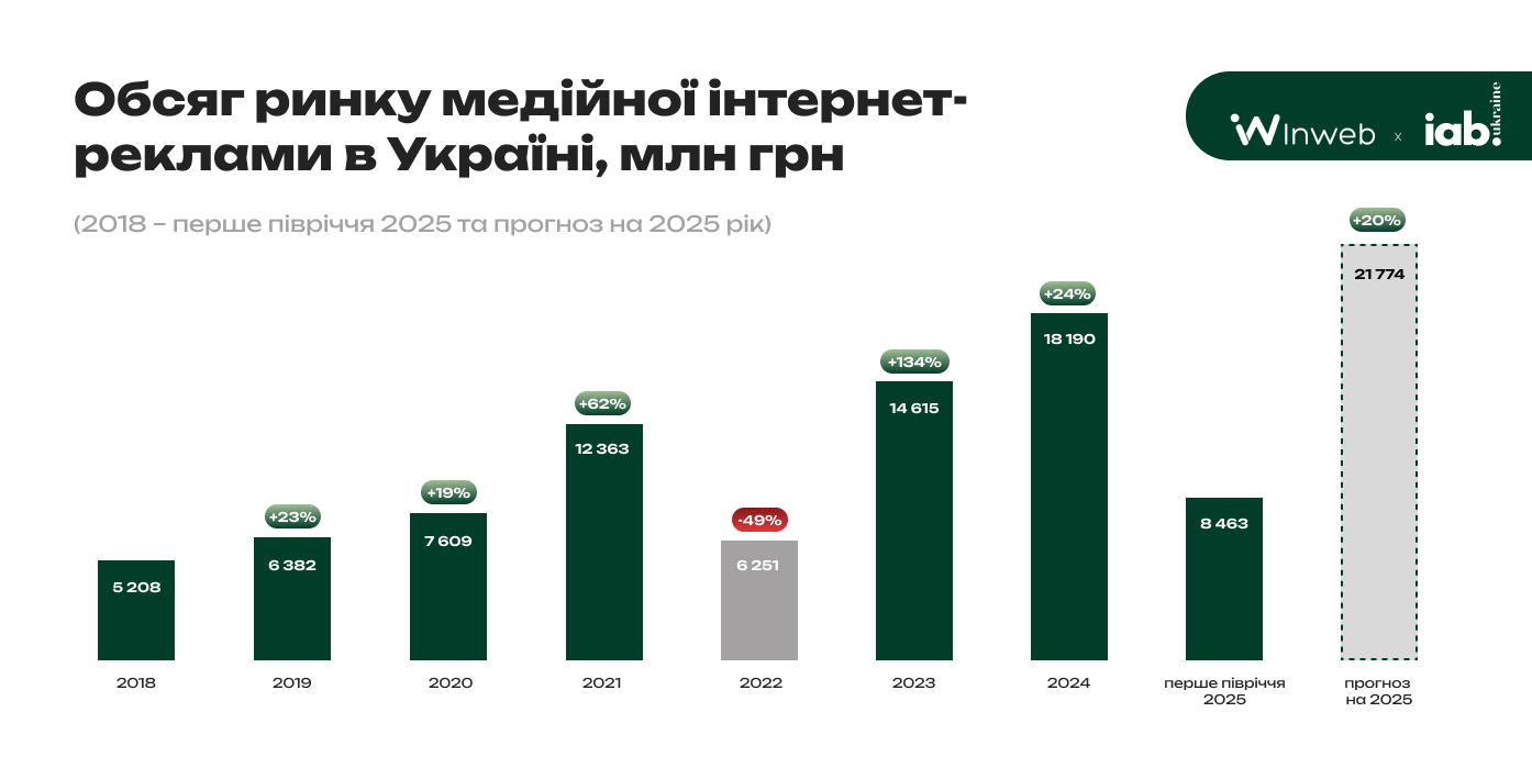 У першому півріччі 2025 року український ринок digital-реклами продовжив демонструвати двозначні темпи зростання. За даними IAB Україна, обсяг медійної реклами склав 8,5 млрд грн, а ринку платного пошуку — 11,4 млрд грн лише за шість місяців.