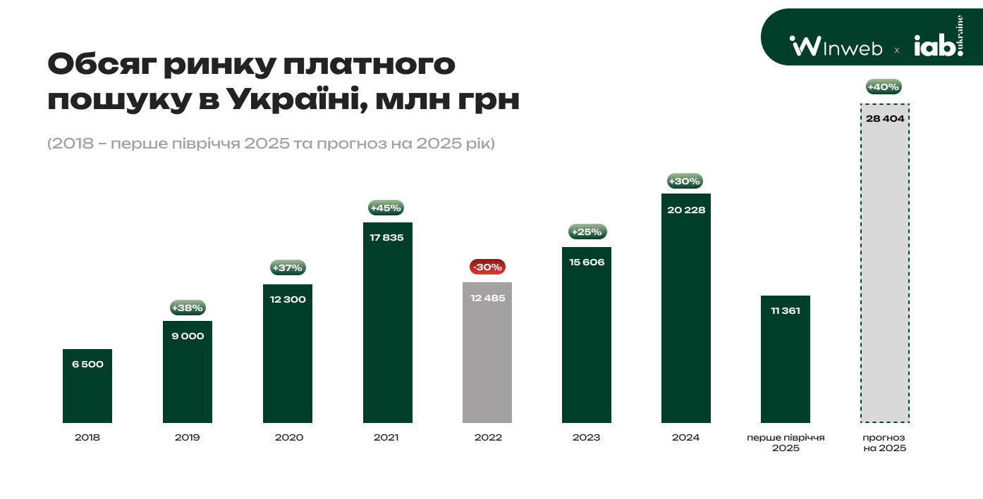 Для порівняння, у 2024 році ринок пошуку зріс на 30% і становив 20 228 млн грн (≈20,2 млрд). За прогнозами, у 2025 році він може зрости ще на 40% і перевищити 28 403 млн грн (≈28,4 млрд).