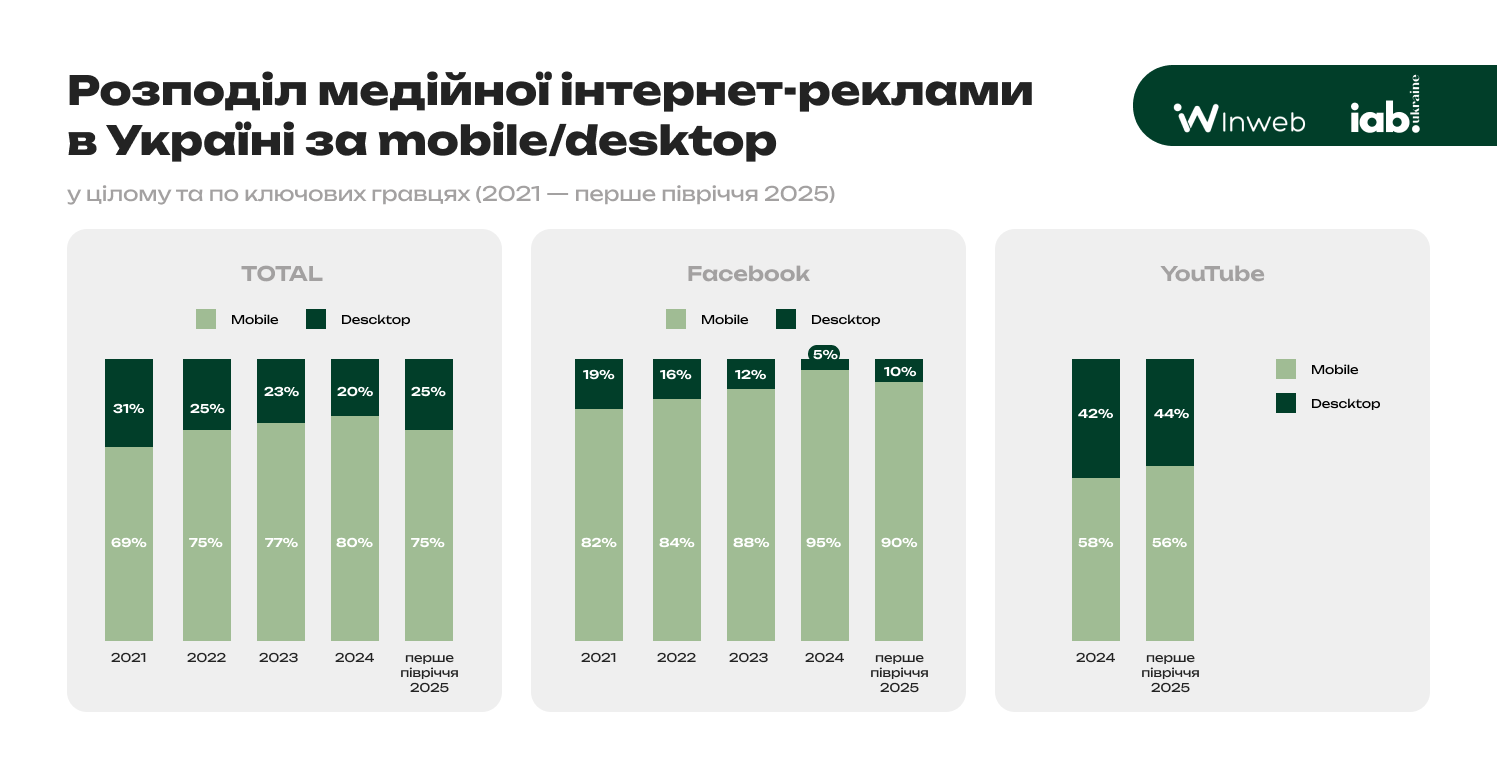 У першому півріччі 2025 року мобільні пристрої зберегли домінування на ринку digital-реклами — на них припадає 75% усіх бюджетів. У Facebook мобайл майже абсолютний: близько 90% показів і витрат йдуть саме на смартфони. Натомість у YouTube майже половина переглядів і рекламних інвестицій припадає на десктопи та великі екрани.