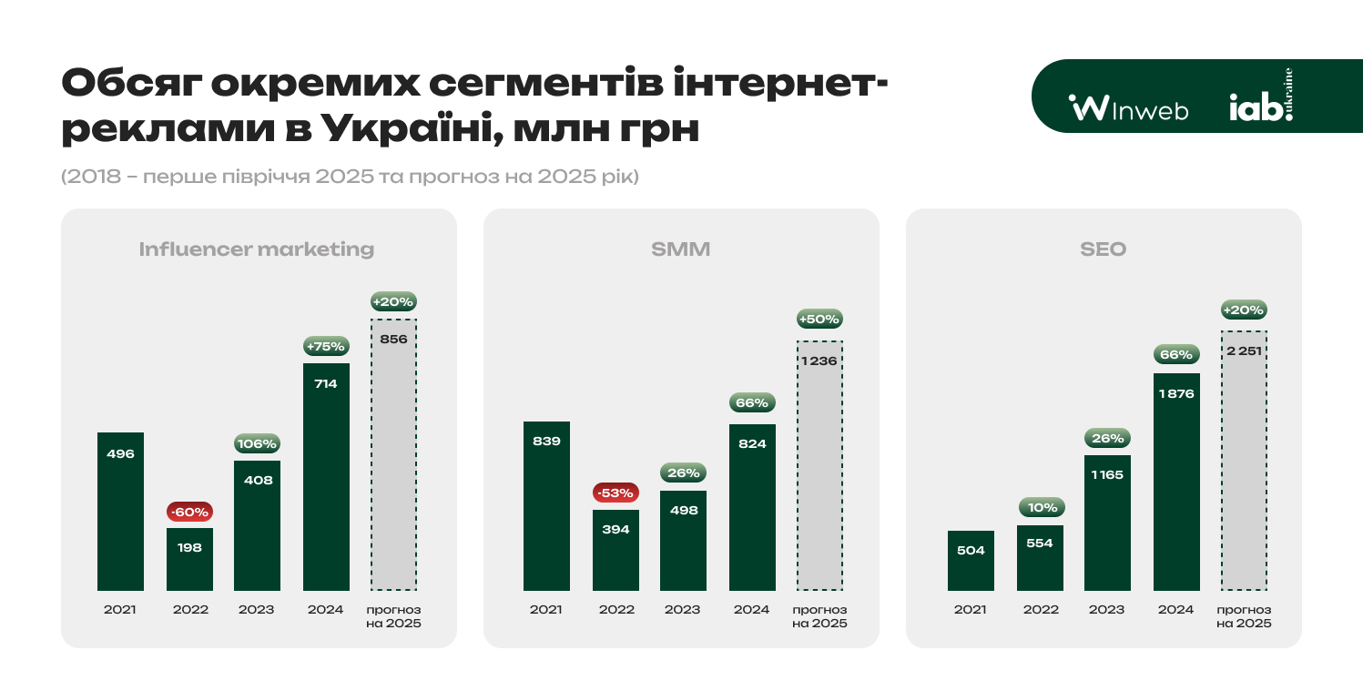 Прогноз на 2025 рік — 856 млн грн. Це майже вдвічі більше, ніж у 2021 році, що підтверджує зростання попиту на співпрацю з лідерами думок.