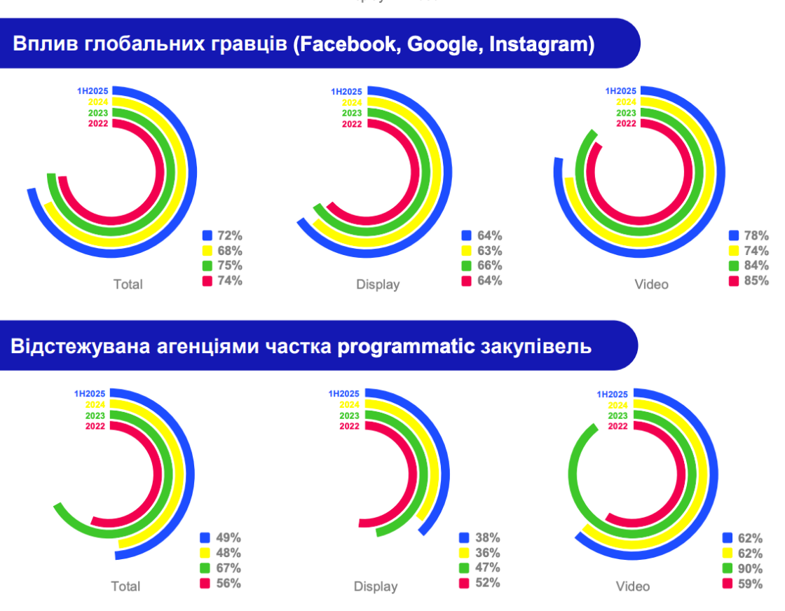 У дисплейній рекламі ці платформи утримують близько двох третин витрат, а у відео їхній вплив сягає 78%. Це підтверджує, що міжнародні сервіси залишаються основою digital-міксів, а локальні інструменти та незалежні закупівлі відіграють допоміжну роль.
