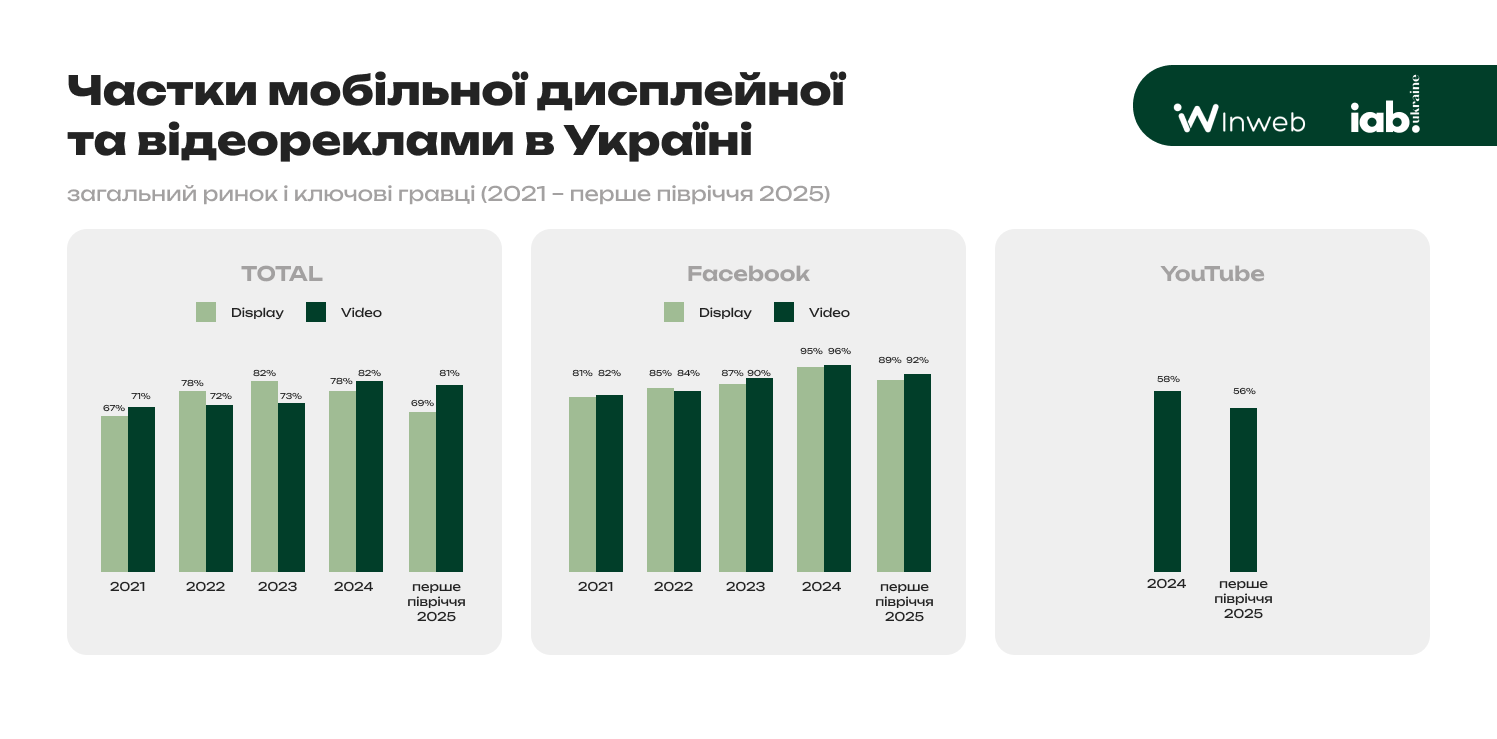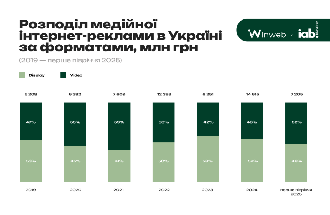 - За підсумками першого півріччя 2025 року знову зафіксовано перевагу відео — 52%, тоді як дисплей становить 48%.
