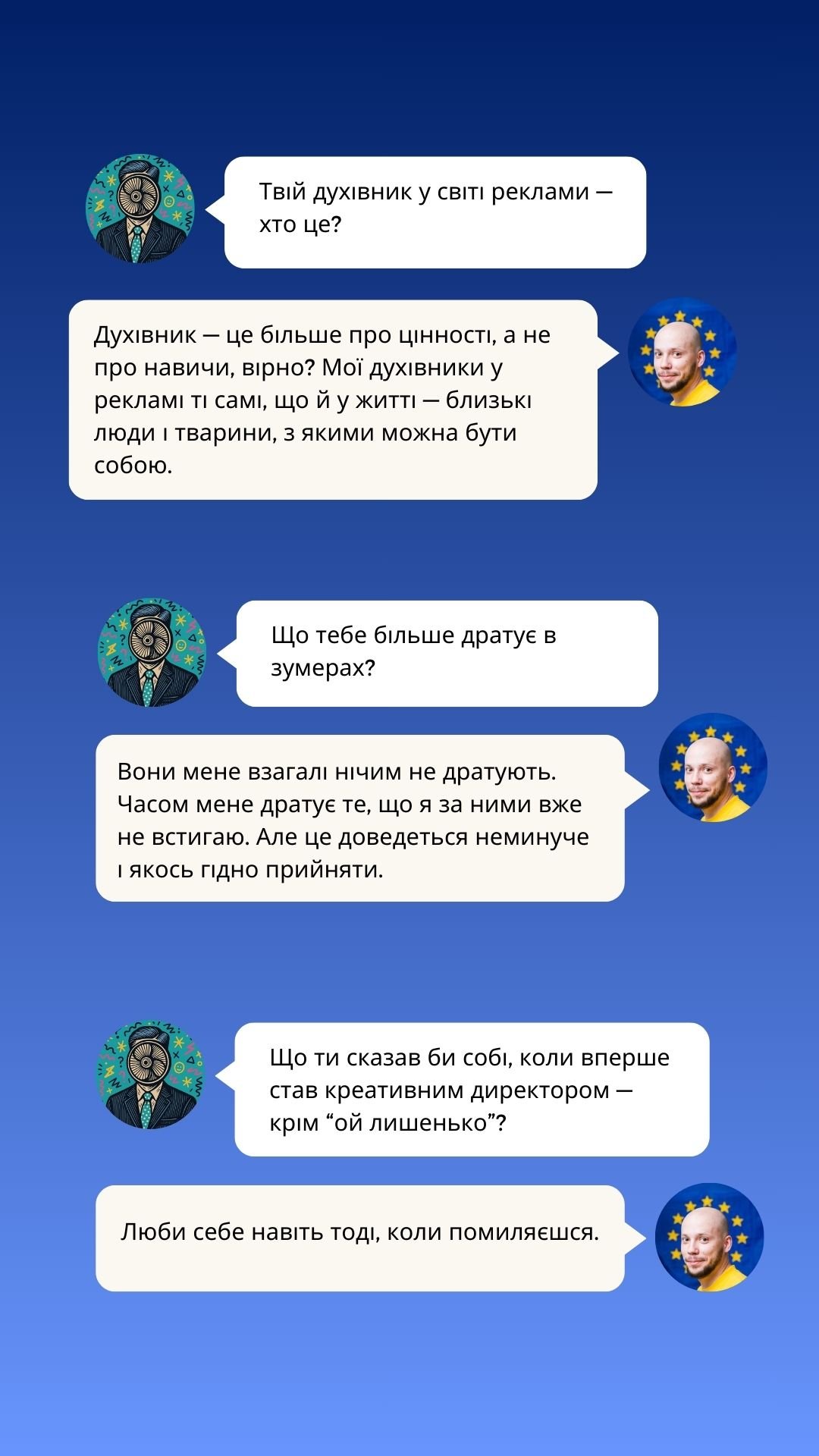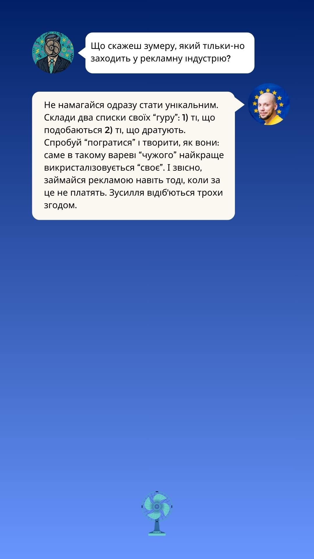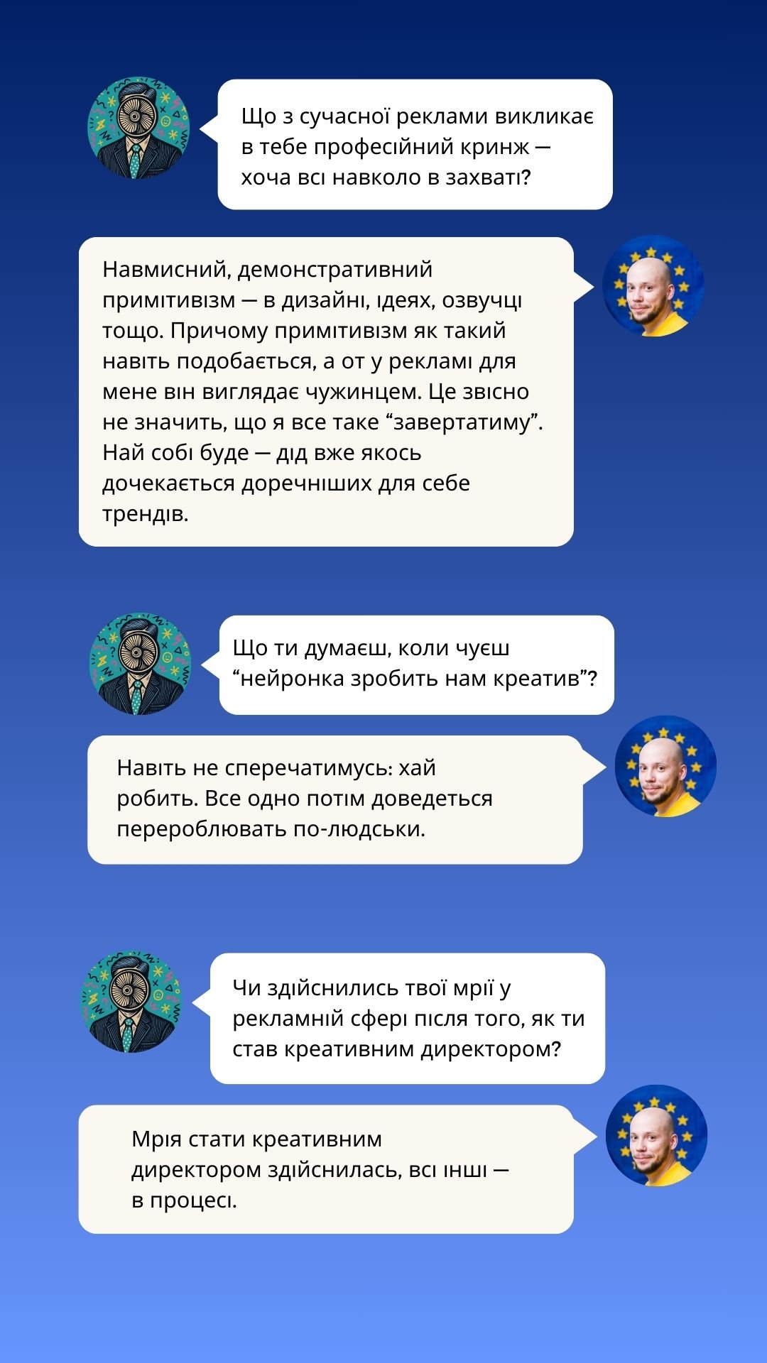 У новому випуску Creative Millennial Blitz від Рекламного Вентилятора ми говоримо з креативним директором, який пам’ятає рекламу довшою за 6 секунд, не боїться зізнатися, що креативний директор — це радше менеджер і ментор, ніж творець, і спокійно дозволяє нейронкам “робити креатив”, знаючи, хто все одно прибиратиме за ними.