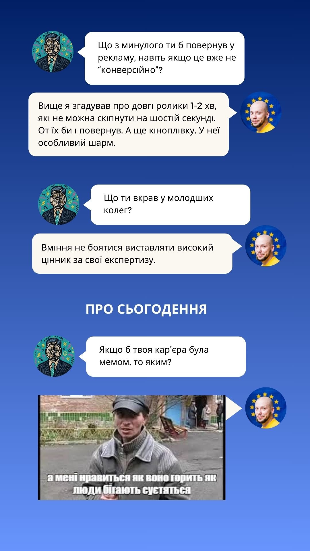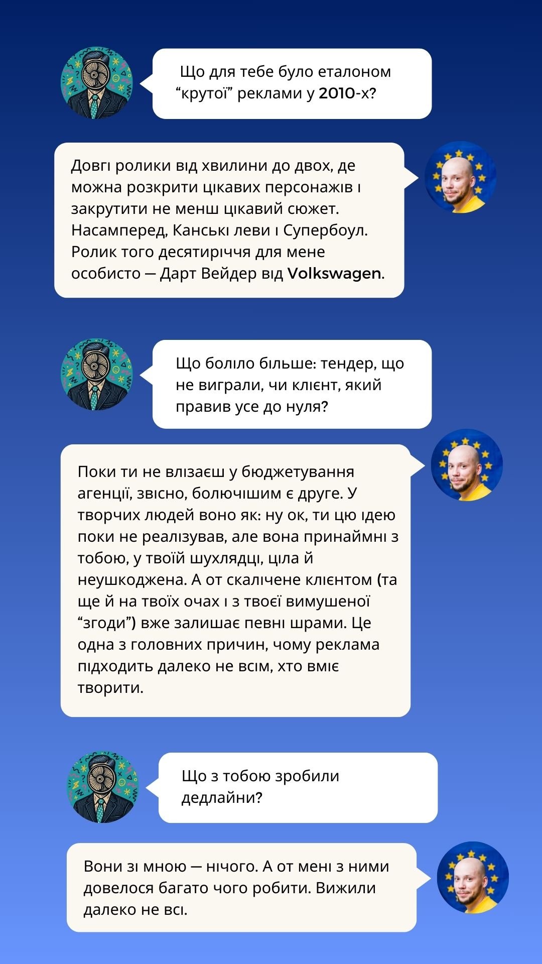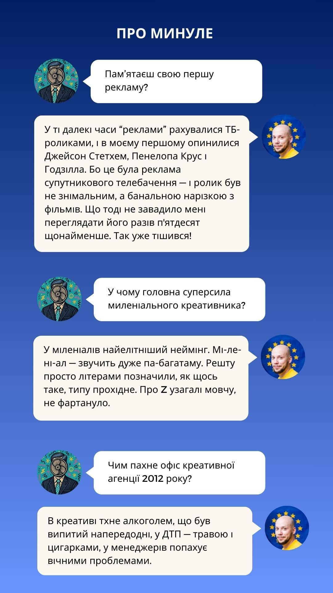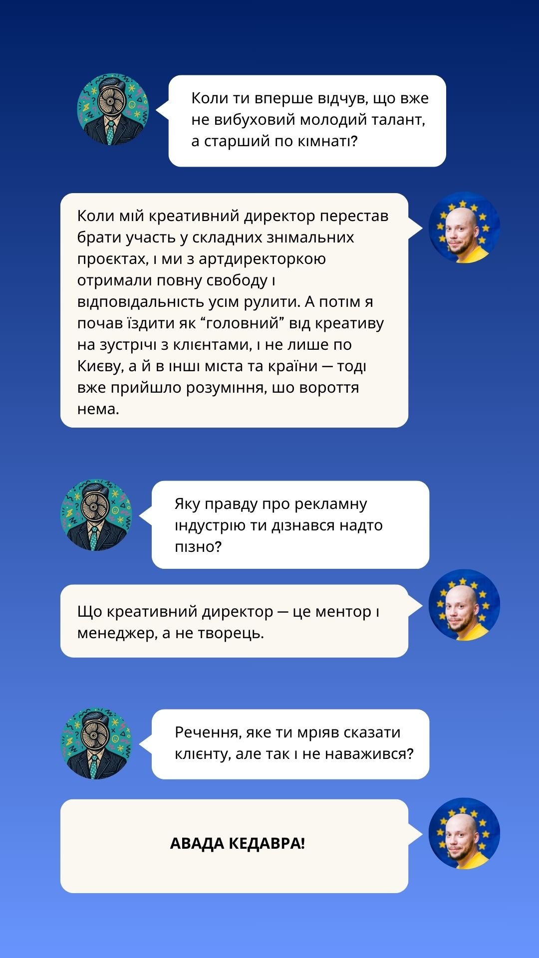 У новому випуску Creative Millennial Blitz від Рекламного Вентилятора ми говоримо з креативним директором, який пам’ятає рекламу довшою за 6 секунд, не боїться зізнатися, що креативний директор — це радше менеджер і ментор, ніж творець, і спокійно дозволяє нейронкам “робити креатив”, знаючи, хто все одно прибиратиме за ними.