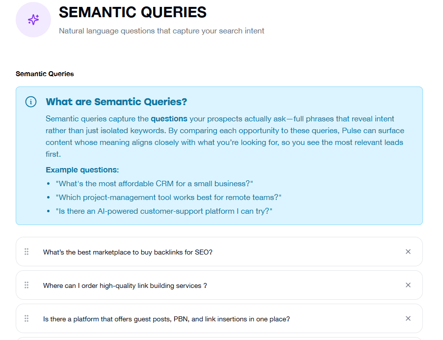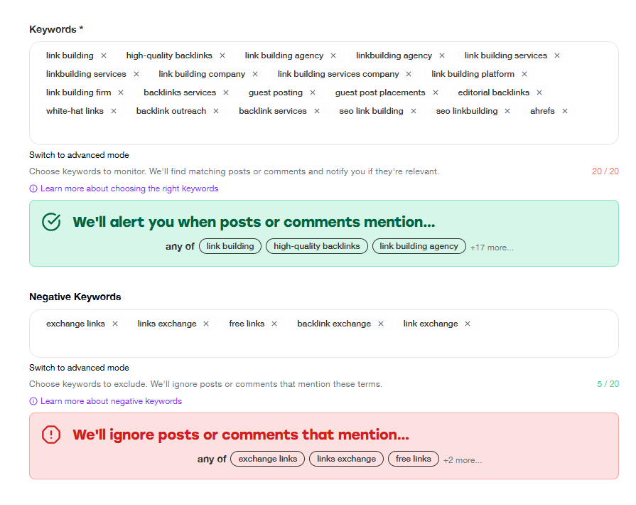 Наприклад: “which agency is best for…”, “anyone recommend a…”, “how much does it cost to hire…”. Такі фрази сигналять вам про комерційний інтент. Додавайте саме такі фрази, якщо хочете, щоб система знаходила “гарячі” ліди, а не просто дискусії.
