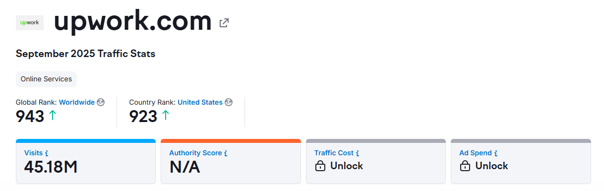 Загальна кількість відвідувань Upwork – понад 45 мільйонів, за даними Semrush за вересень