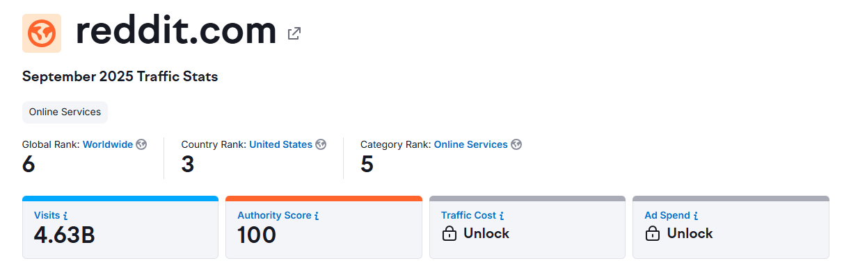 Загальна кількість відвідувань Reddit – понад 4 мільярди, за даними Semrush за вересень