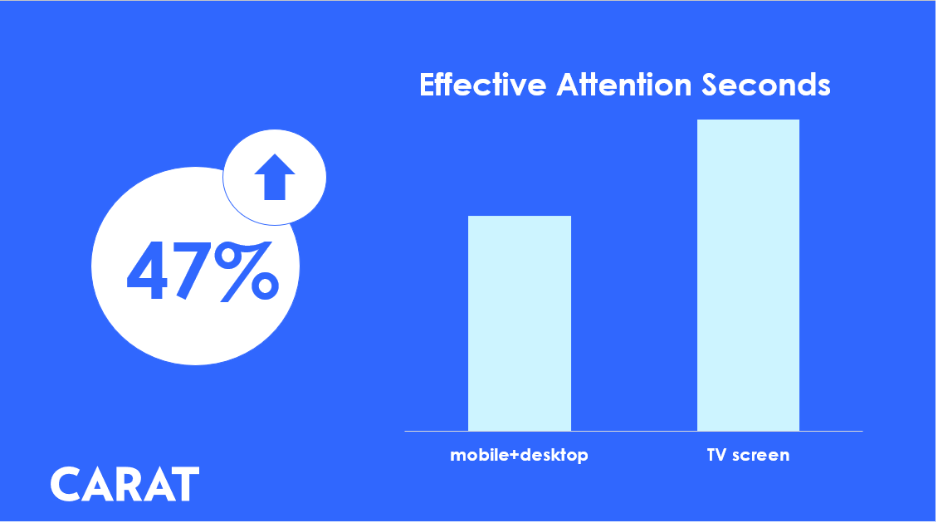 Унікальні дані Ukrainian Media Attention Research, проведеного dentsu спільно з Wantent, дають чіткий сигнал для ринку: телевізійний екран утримує увагу українського глядача набагато довше. Середня тривалість фокусування тут виявилася на 47% вищою, ніж у мобільному чи десктопному середовищі. Це не просто цифра - це доказ того, що великий екран створює зовсім інший, глибший тип взаємодії з контентом, який складно відтворити на маленьких дисплеях.