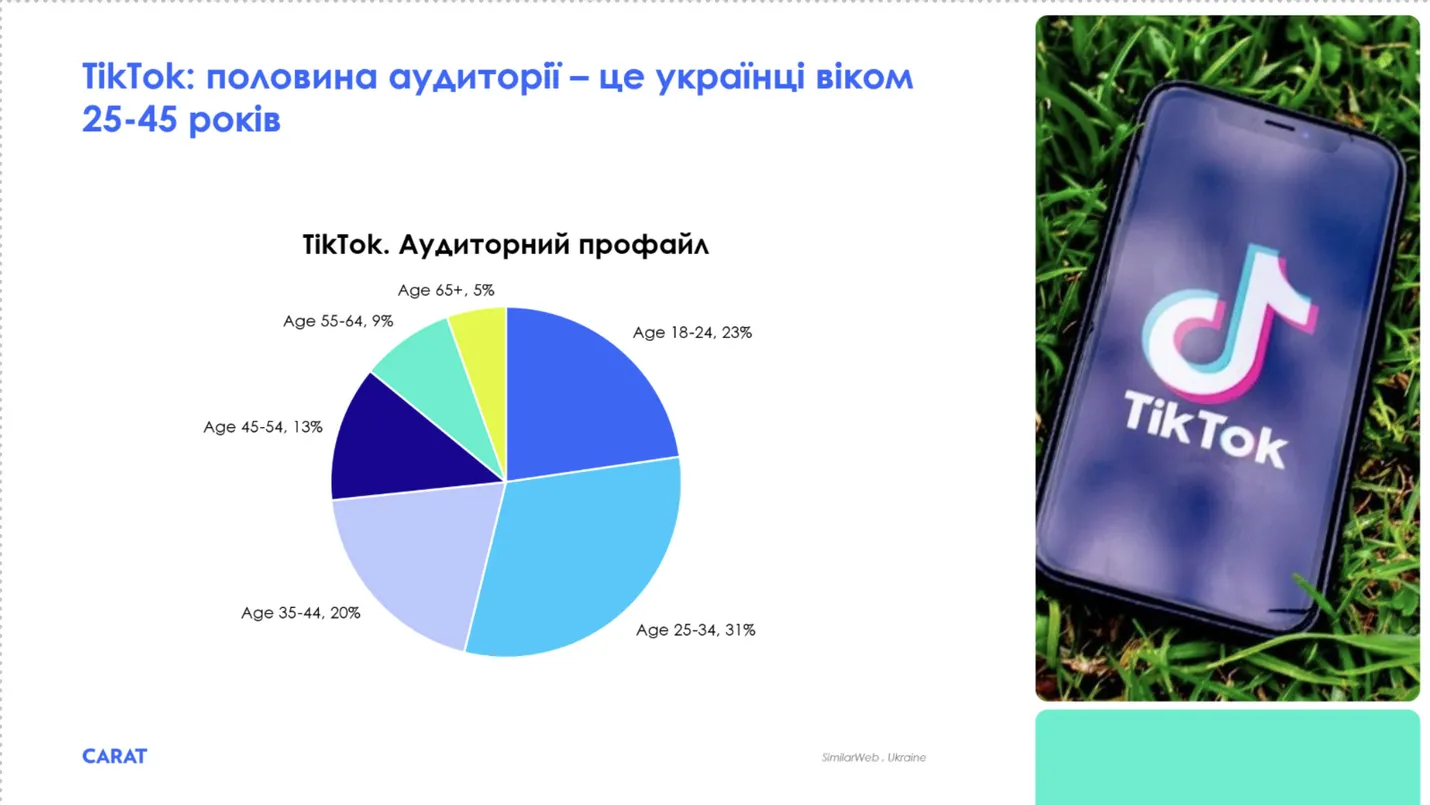 • Близько 50% користувачів TikTok в Україні — у віці 25–45 років (за даними SimilarWeb; аудиторія, доступна для аналізу — віком 18+),