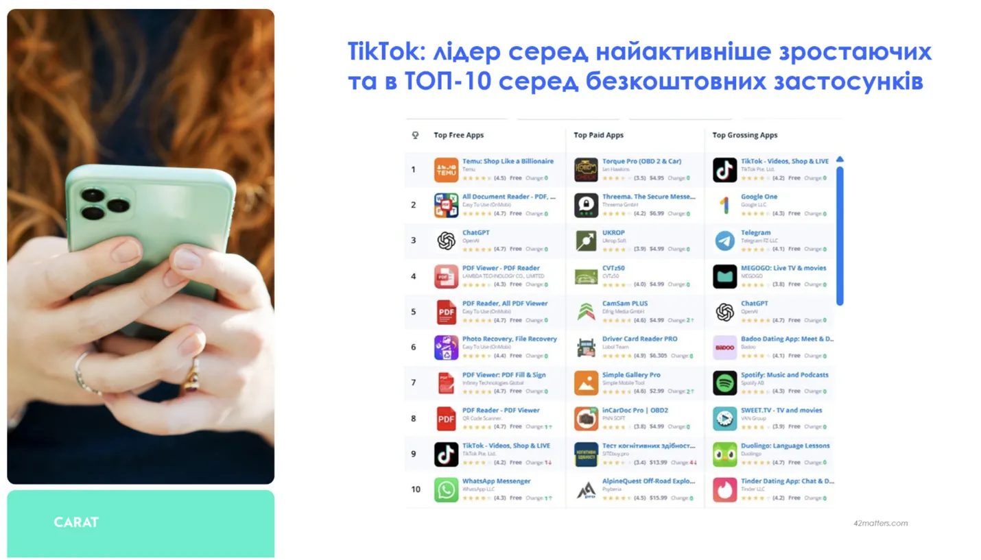 У 2025 році застосунок TikTok стабільно входить до ТОП-10 за використанням згідно з даними 42matters.com, а також є найшвидше зростаючим застосунком за кількістю аудиторії.