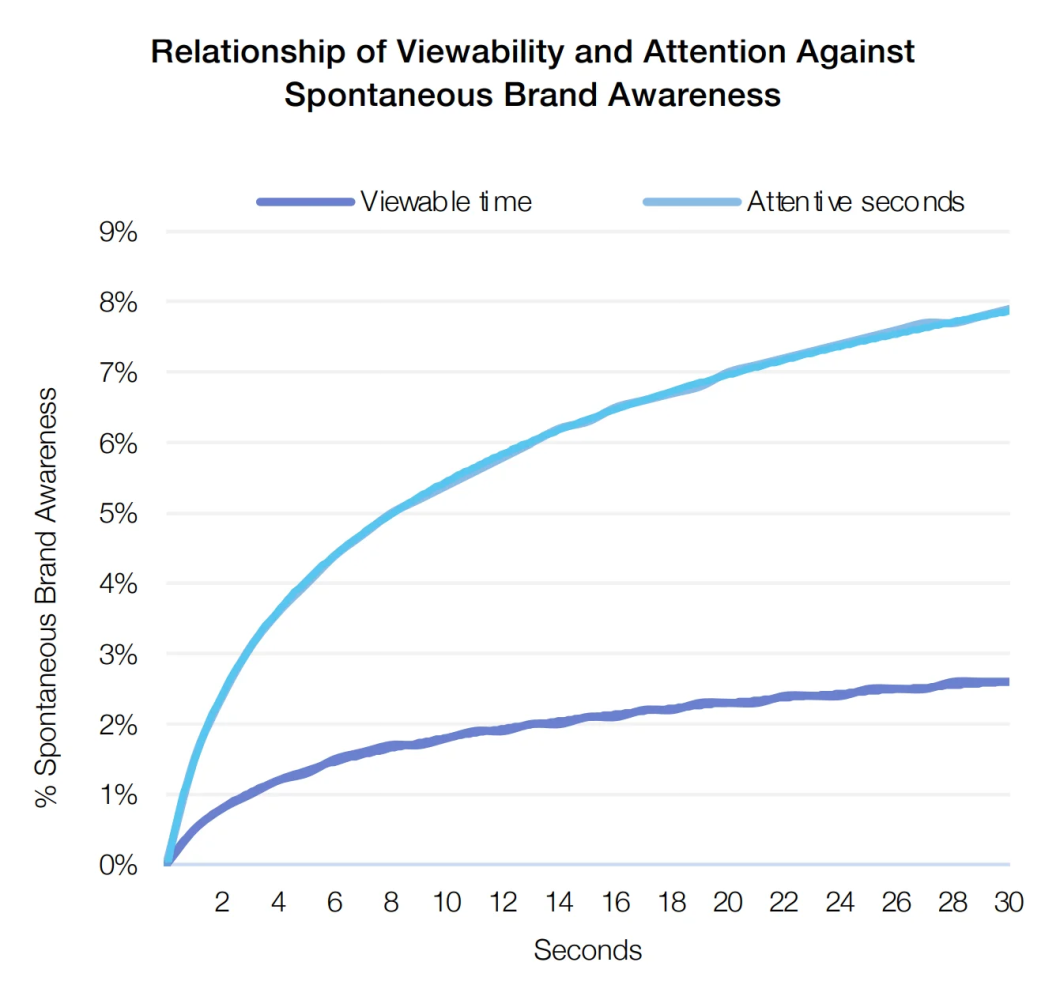 Ось графік, який показує, наскільки сильніше на Ad Recall впливають секунди уваги, ніж секунди перебування у зоні видимості (Viewability).