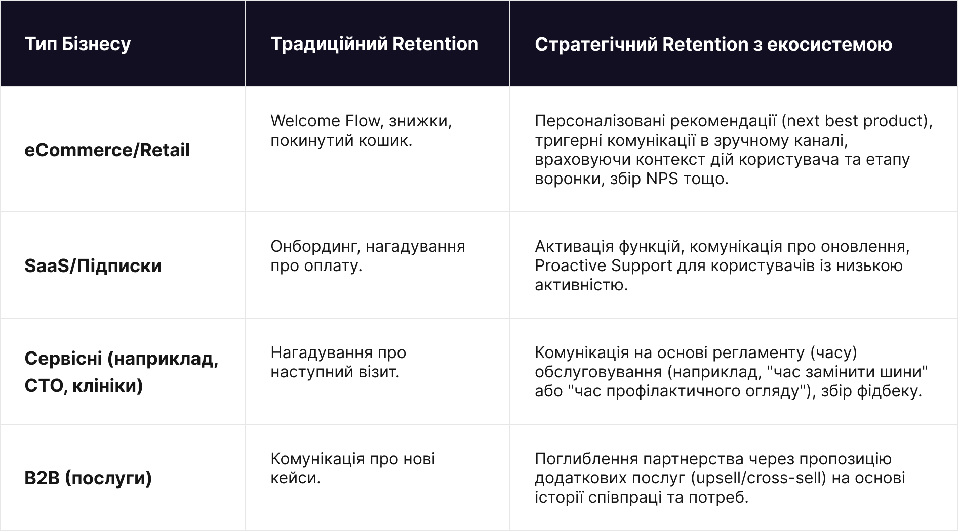 Саме тому сучасний Retention виходить за межі однієї розсилки і повинен включати: