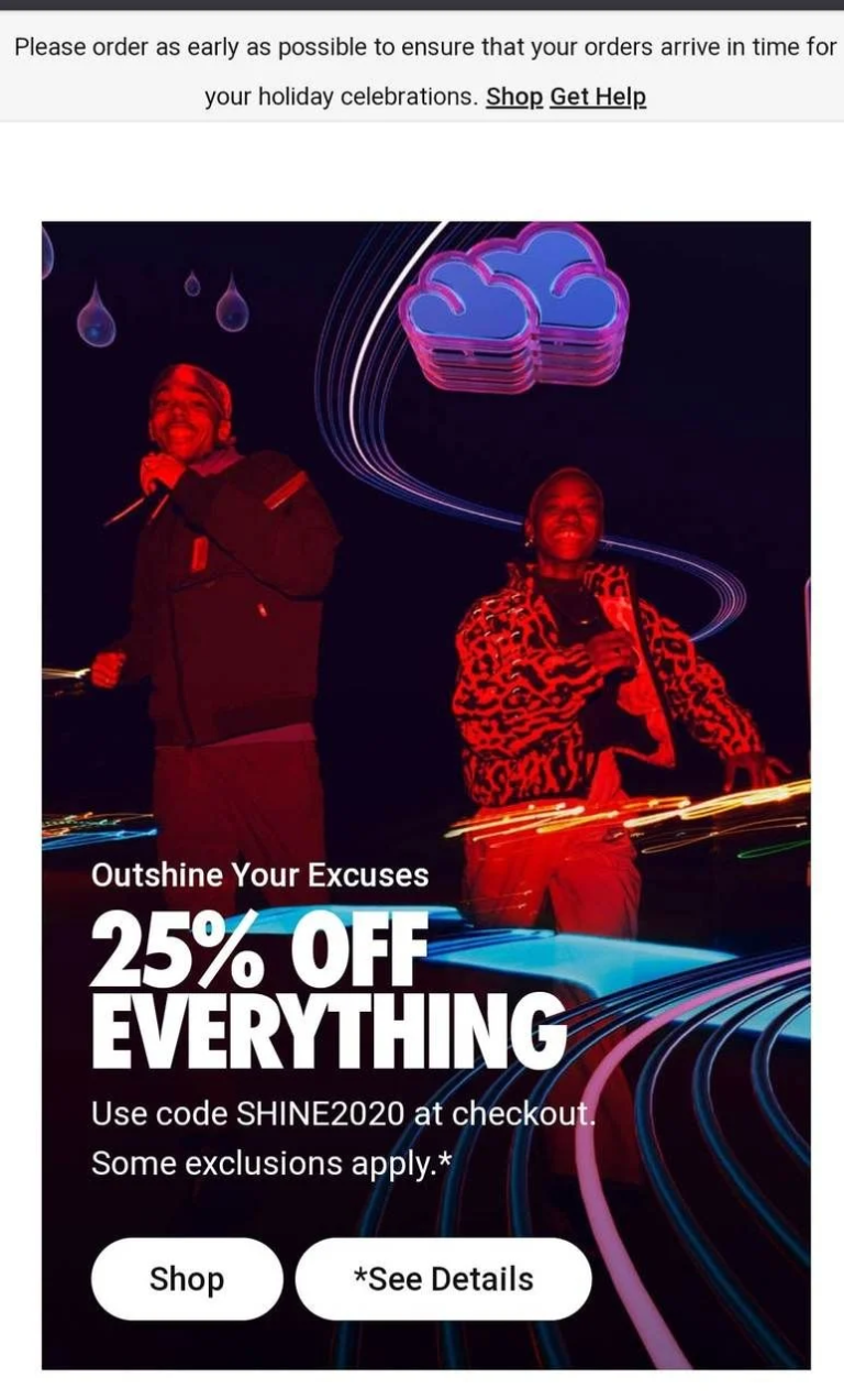 У сфері fashion популярні значні site-wide знижки. H&M, Zara, Nike у 2024 році пропонували наприклад, 25-30% на весь асортимент або окремі акції типу «друга річ за пів ціни».
