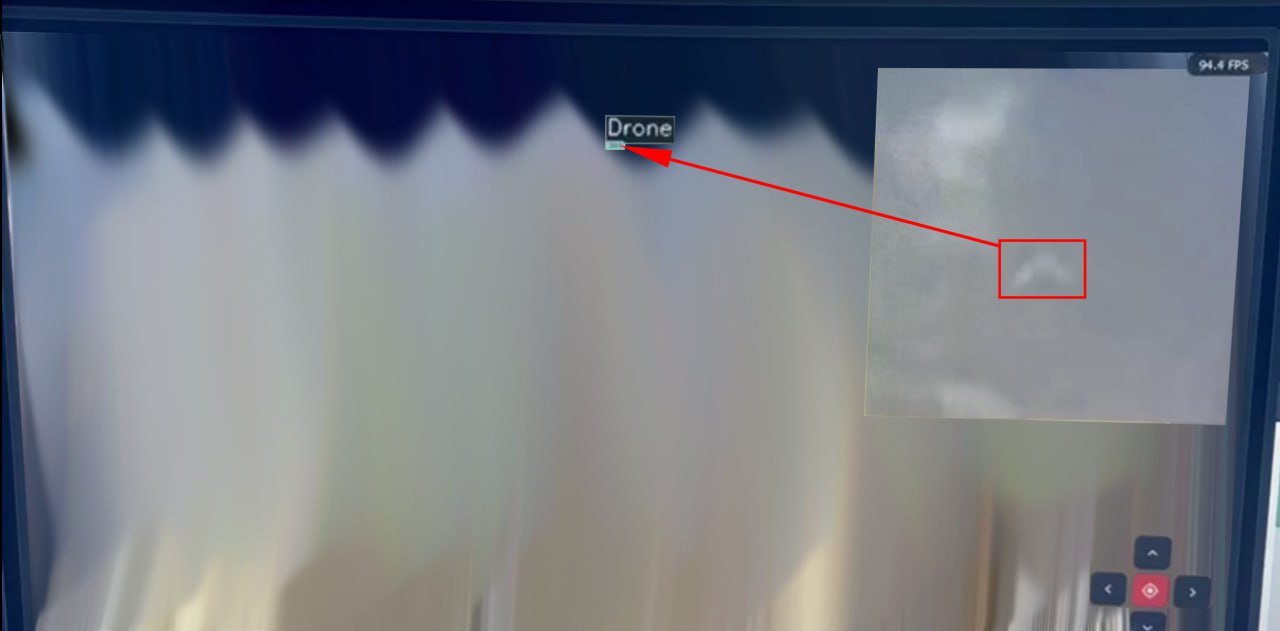 Людське око на моніторі погано розрізняє статичні точки на динамічному фоні (небо/хмари). FPV, що летить строго на вас, виглядає як нерухома точка, що зростає у розмірі.