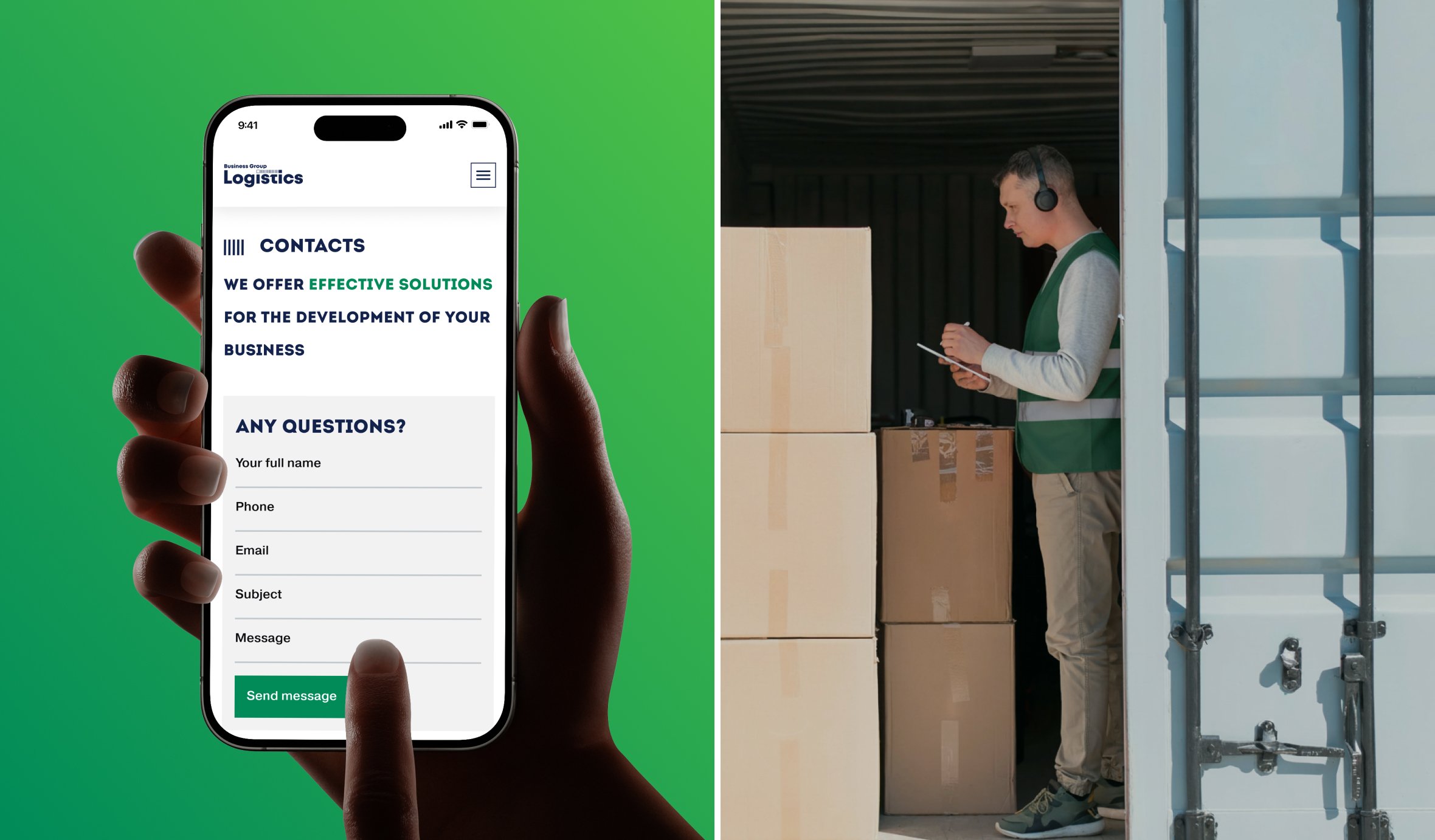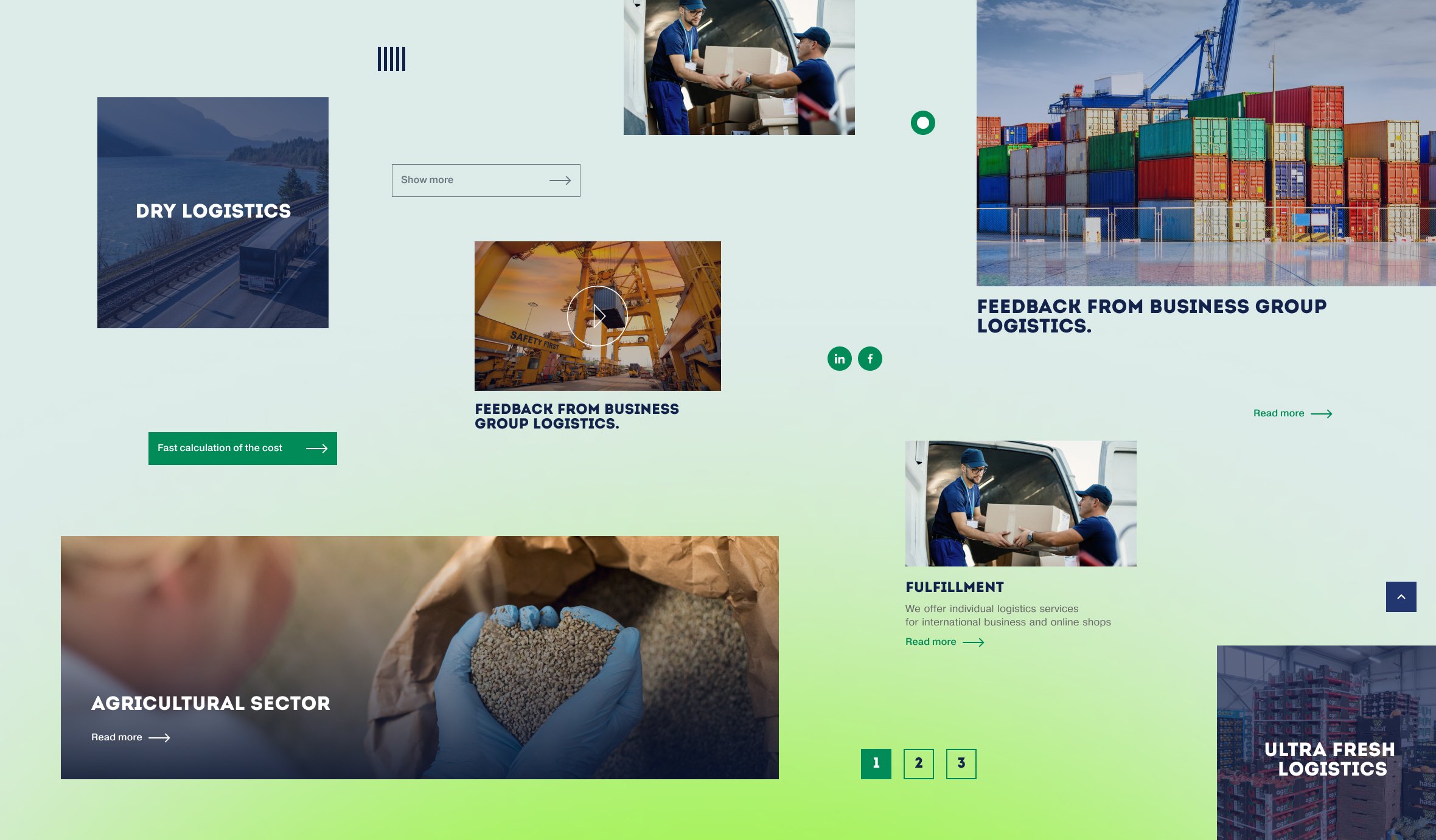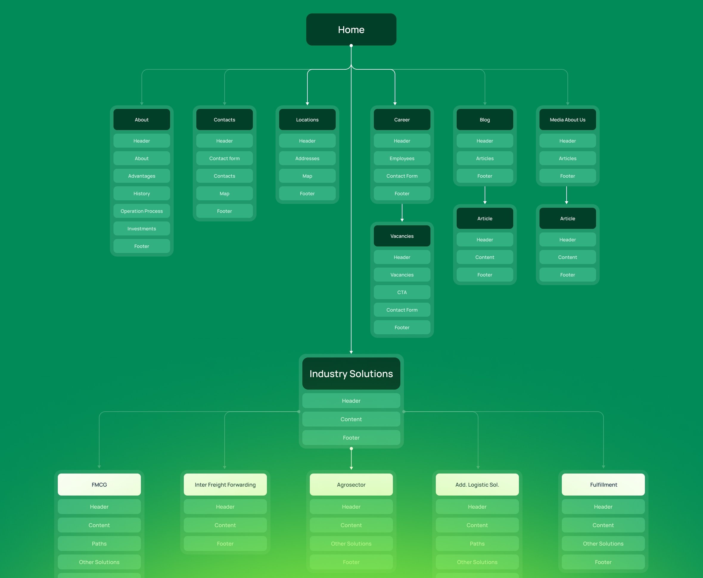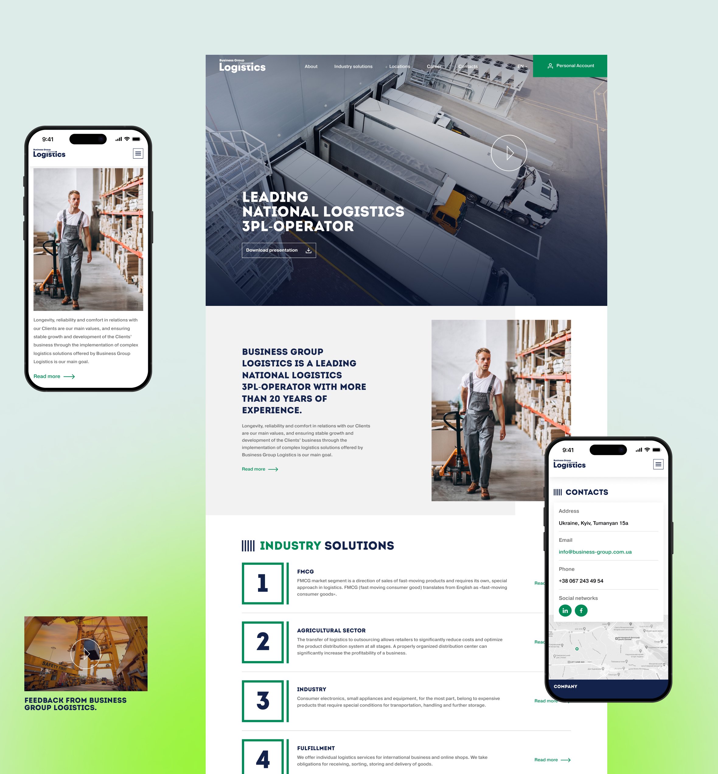 Ми інтегрували дизайн сайту в загальну систему візуальної ідентифікації бренду, взявши за основу напрацювання партнерів — від презентаційних матеріалів до схем складської логістики. Це дозволило нам не лише зберегти впізнаваність, а й посилити її в цифровому середовищі за допомогою фірмової типографіки та стратегічної палітри кольорів: глибокий синій транслює надійність 3PL-оператора, яскравий зелений акцентує на постійному розвитку, а нейтральний сірий підкреслює технологічність процесів.