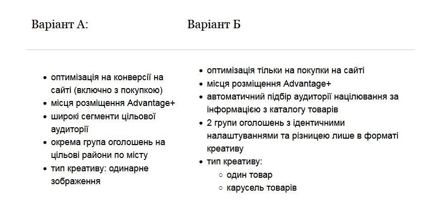Спільно з клієнтом ми прийняли рішення про проведення експерименту для визначення більш ефективного варіанту налаштувань рекламних кампаній.