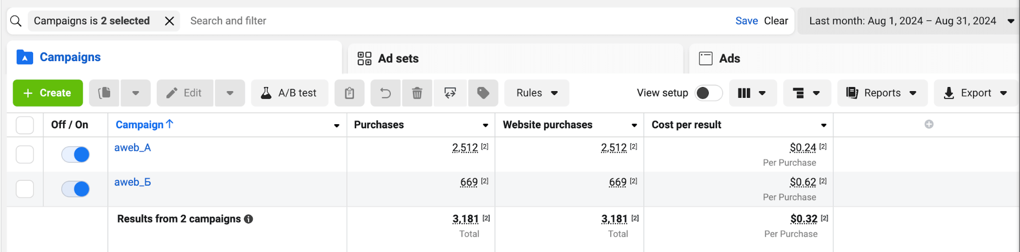 За результатами паралельної роботи двох кампаній, однозначно більш ефективною виявився варіант A — налаштування кампанії за методом, який застосовується для просування послуг.