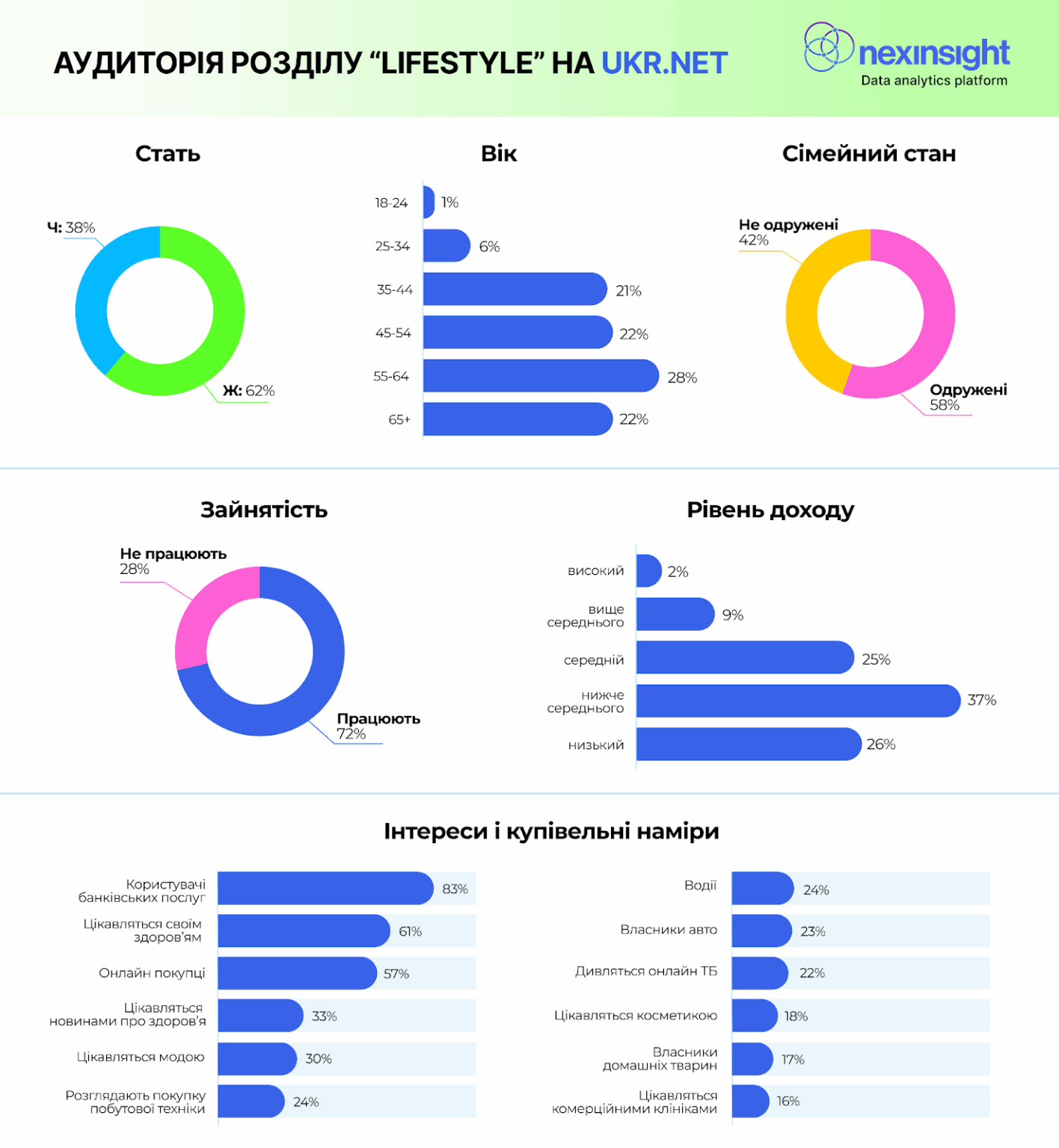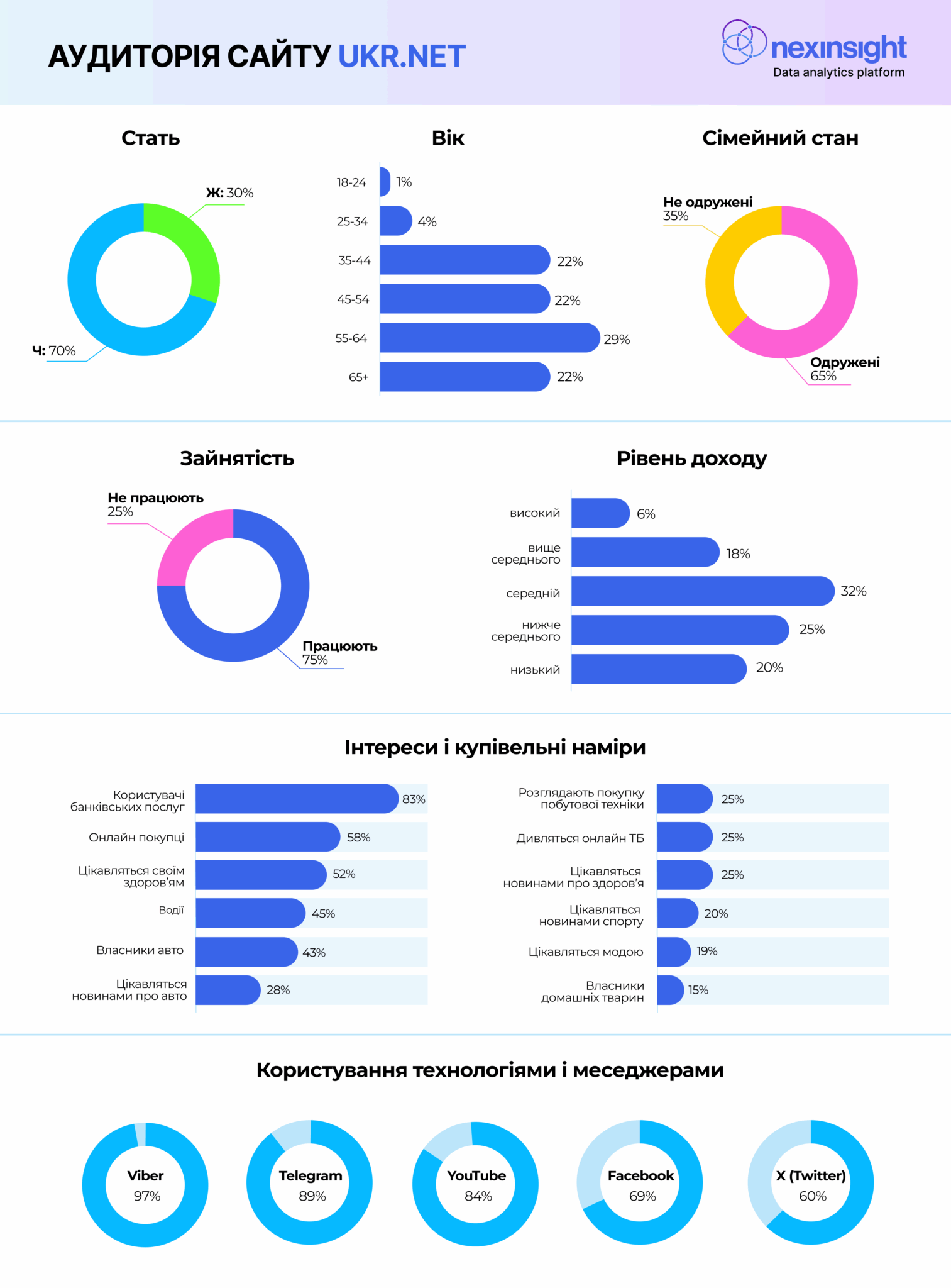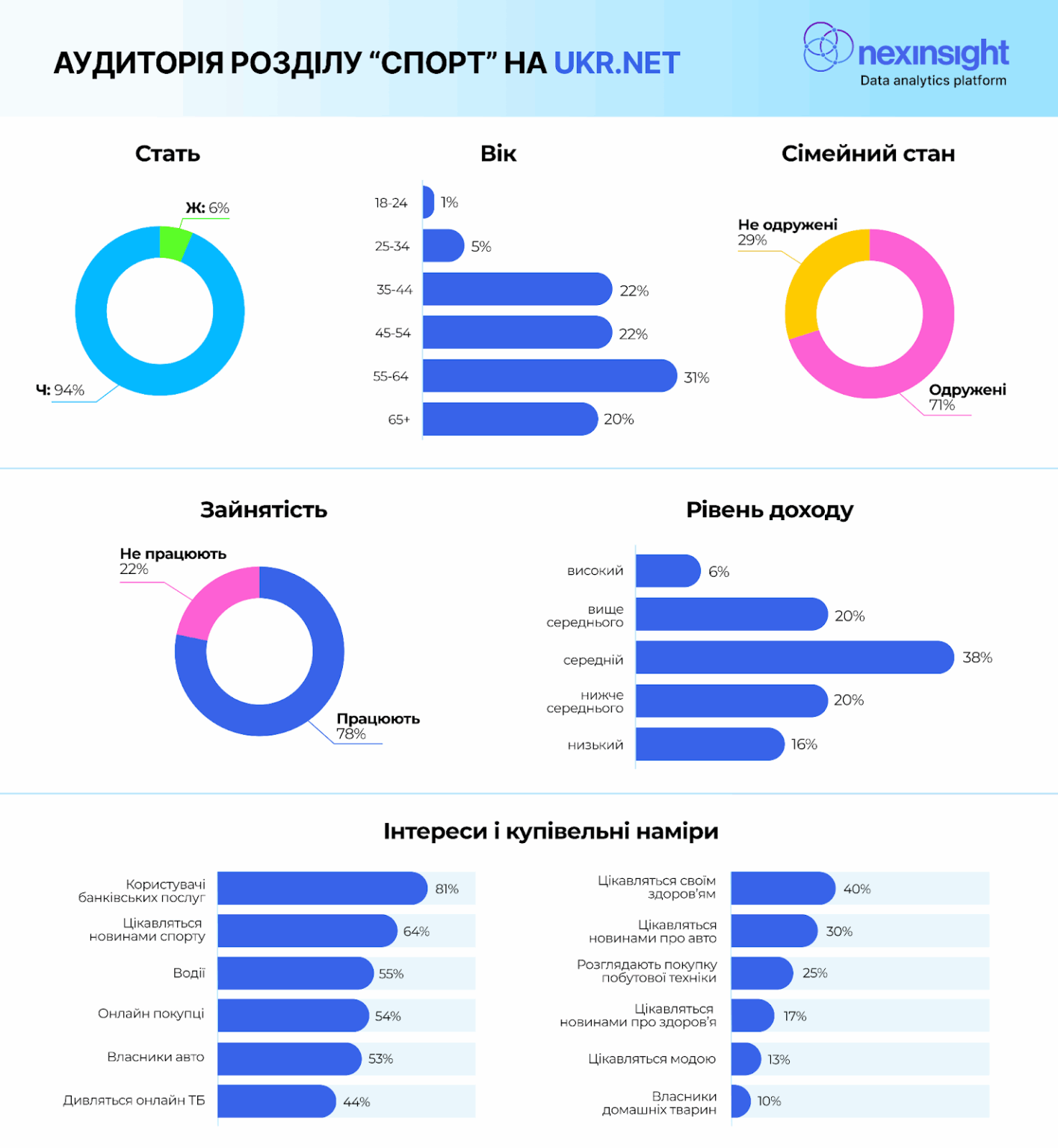 Вимірювання Nexinsight показали, що аудиторія Ukr.net — це переважно чоловіки 35+. Вони працюють, платоспроможні (доходи на рівні середній і вище). Майже 60% — активні онлайн-покупці. Кожен другий — водій або власник авто. Значна частина аудиторії — читачі новин про спорт, автомобілі або здоров’я.