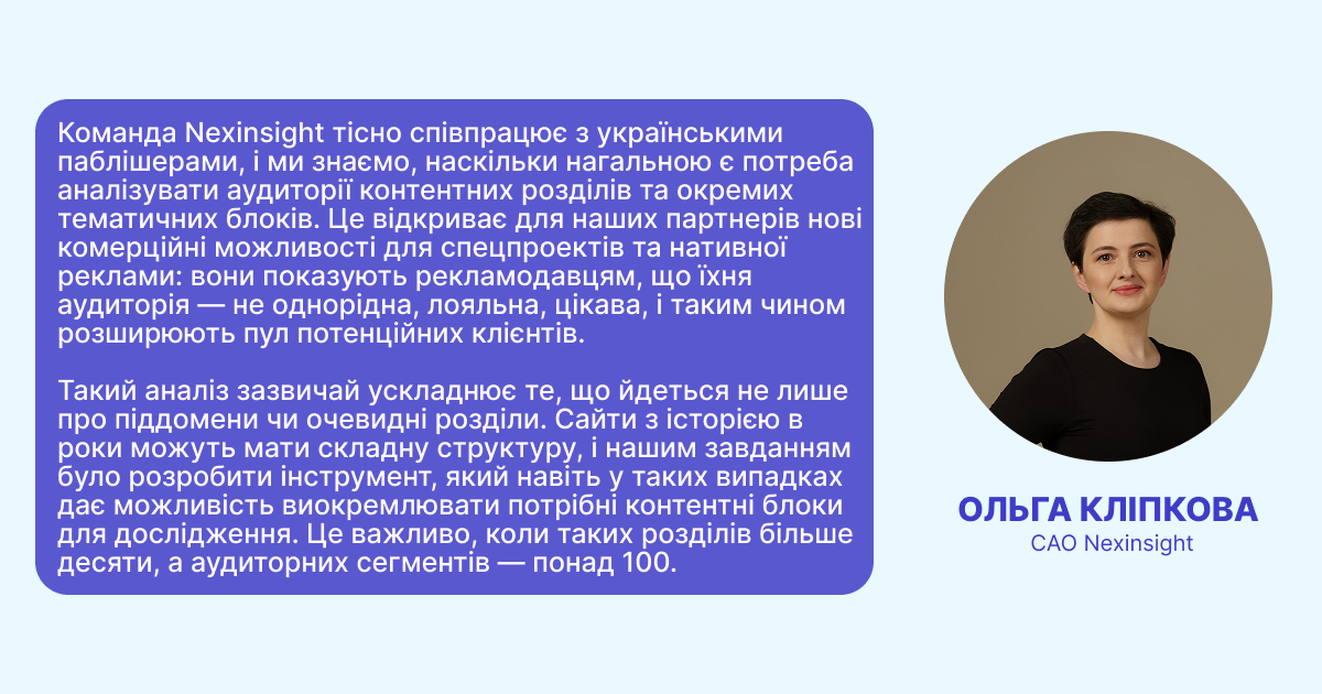 Саме тому команда Ukr.net звернулася до Nexinsight. Платформа дозволяє легко проводити аналіз аудиторії в розрізі піддоменів, контентних блоків і тематичних напрямів — навіть у випадку складної структури порталу. Розділ «Спорт», «Політика» чи «Здоровʼя» — кожен можна дослідити окремо, побачити відмінності в аудиторії та зробити на цьому сильну комерційну ставку.
