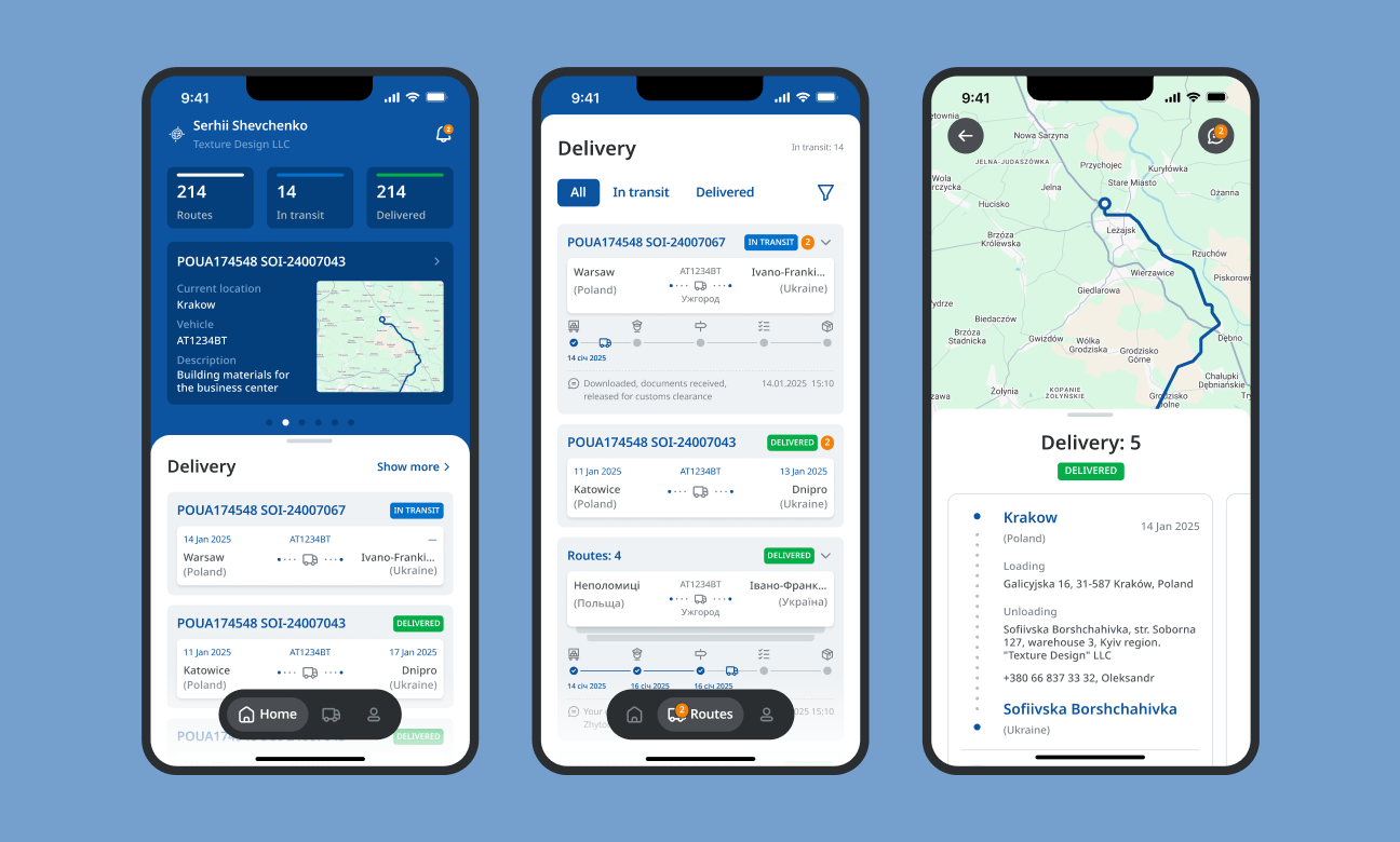 Користувачі можуть переглядати поточний статус вантажу та деталі маршруту на карті, фільтрувати рейси за потрібними параметрами, а також миттєво зв’язуватись із менеджером.