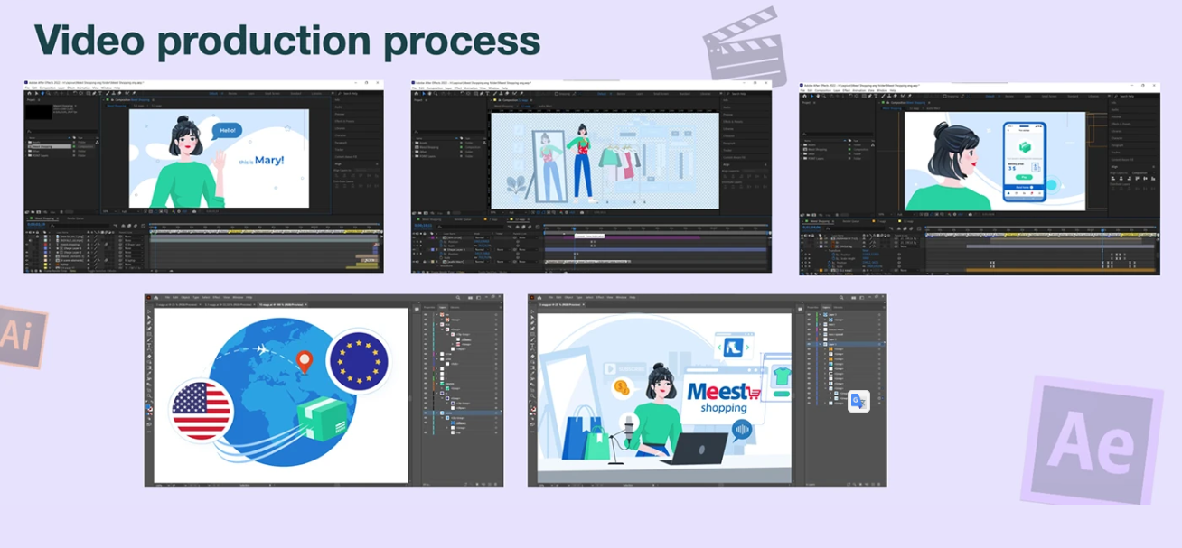 Після ознайомлення з інформацією про Meest Shopping ми проаналізували продукт, визначили цільову аудиторію та поставили цілі компанії. Використовуючи ці дані, ми розробили сценарій. Щоб зробити відео більш захоплюючим, ми запропонували команді Meest Shopping кілька варіантів озвучення, і вони обрали той, що підійшов найкраще. Далі ми створили повний сторіборд та анімували відео. Після отримання зворотного зв’язку від клієнта ми швидко внесли зміни відповідно до їхнього бачення. Нарешті, ми представили фінальну версію у форматі Full HD.