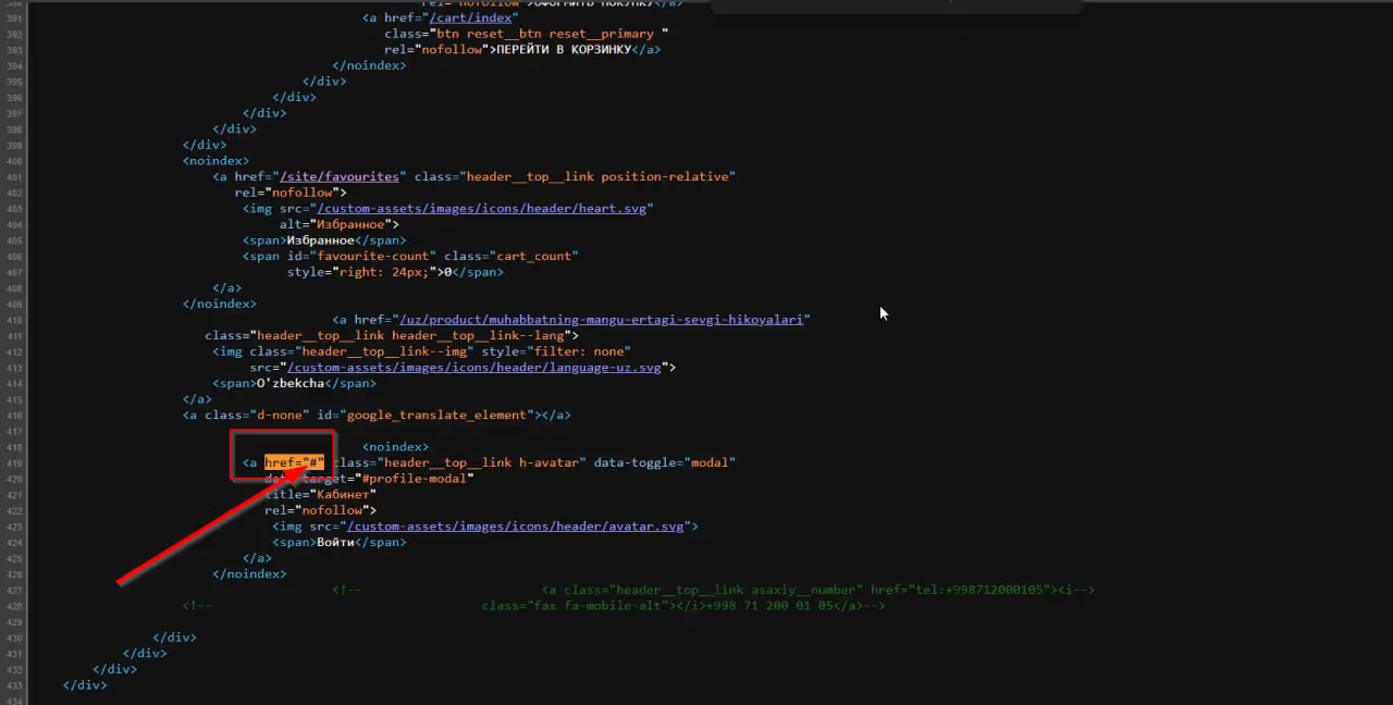 Наступним фактором виявився URL, що генерувався при кліку на кнопку входу на сайт. Кнопка містила символ «#», який додавався до поточного URL. Для користувачів це працювало коректно: з’являлось вікно входу або реєстрації. Але для ботів такі URL викликали 500-ту помилку, оскільки адреси не коректно оброблялися сервером.