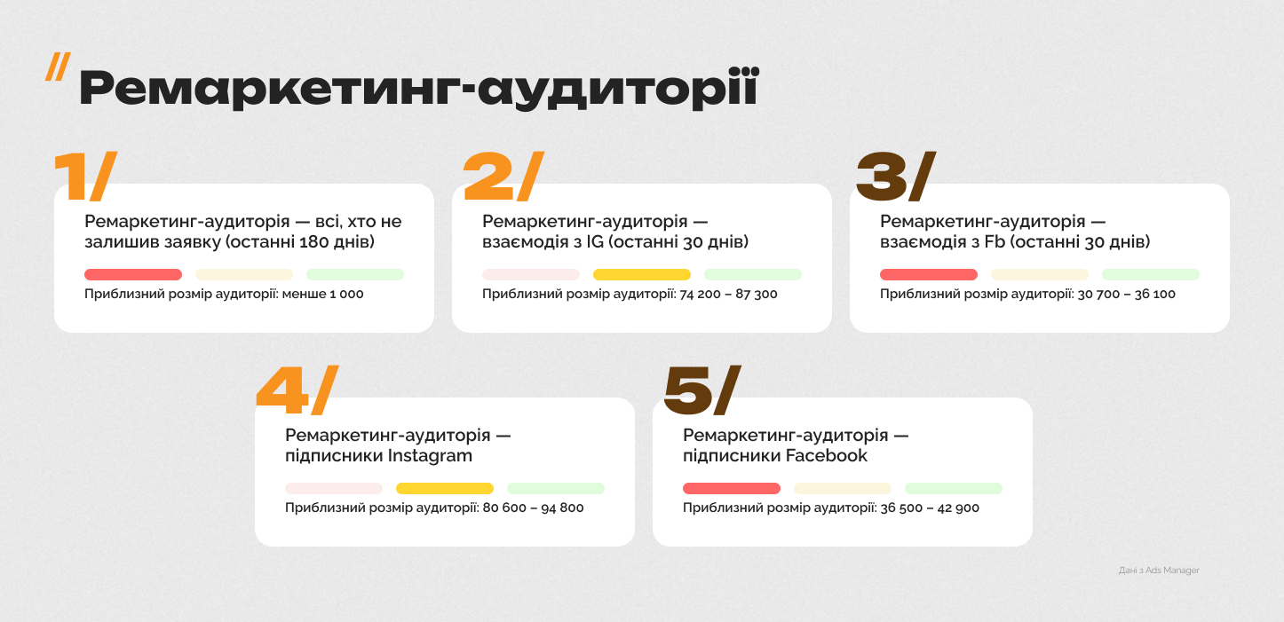 Ремаркетинг-аудиторія — користувачі, які відвідали сайт, але не залишили заявку, а також ті, хто взаємодіяв із соціальними мережами, але не зробив заявки. Сумарний приблизний розмір аудиторії ремаркетингу за різними когортами — 245 000.