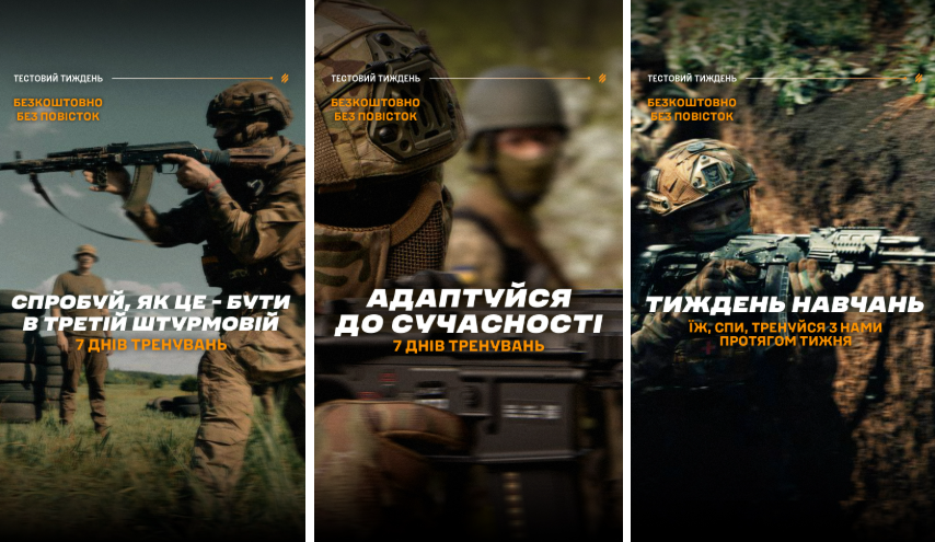 У кампаніях на «Тестовий тиждень» спонукали кандидатів зробити перший крок до служби, але при цьому підсвічували, що цей крок не є остаточним і залишає їм право вибору («Затестуй Третю штурмову», «Навчись захищати і рятувати», «Тренуйся тиждень з трійкою», «Як це — бути в Третій штурмовій»).