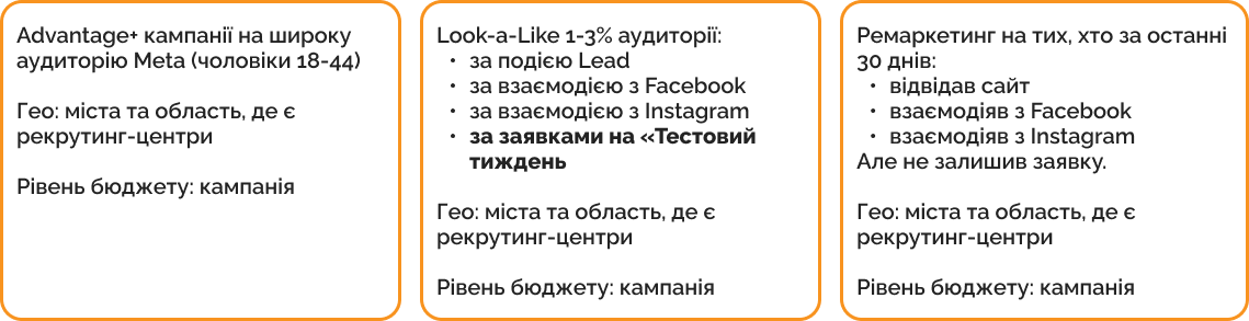 - Look-a-Like 1-3% за подією Lead, за взаємодією з Facebook та Instagram та тих, хто прийшли до рекрутинг-центру;