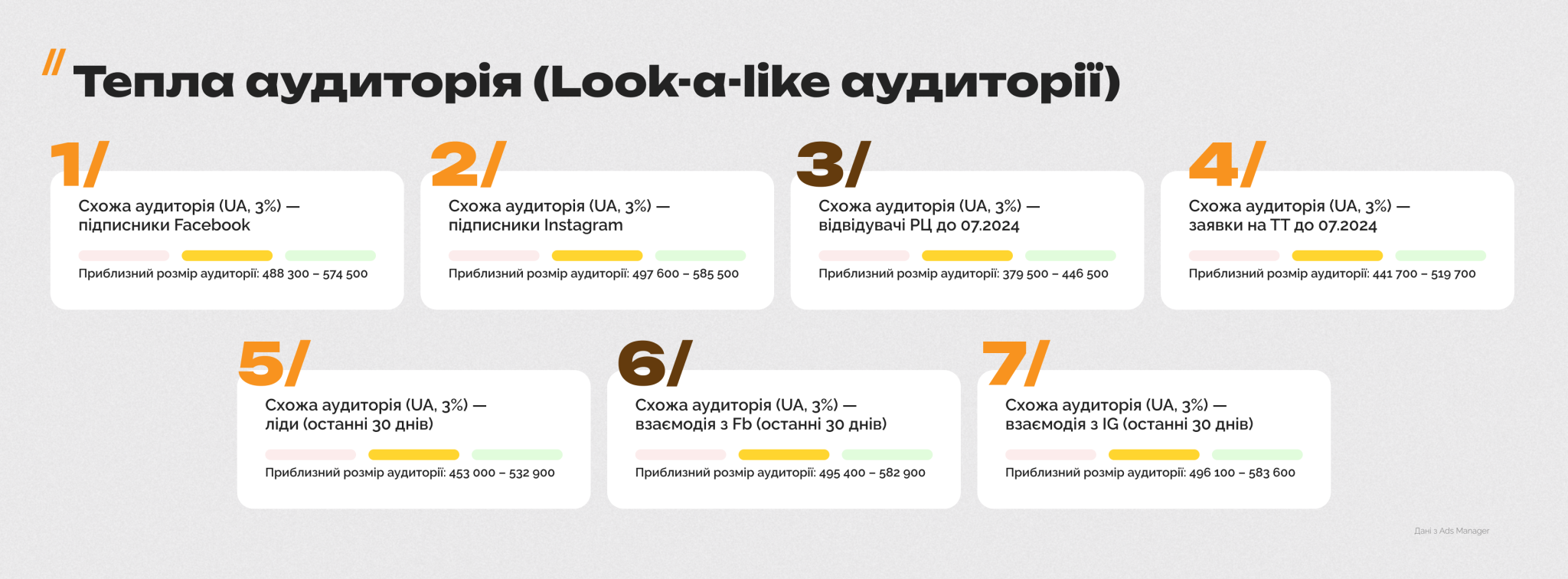 Тепла аудиторія (Look-a-like аудиторії) — користувачі, які найбільш схожі на тих, хто вже залишав заявку або взаємодіяв з 3 ОШБр, а також ті, хто активно переглядає та взаємодіє з контентом у соціальних мережах (Facebook, Instagram). Сумарний приблизний розмір аудиторії LAL за різними когортами — 3 400 000.