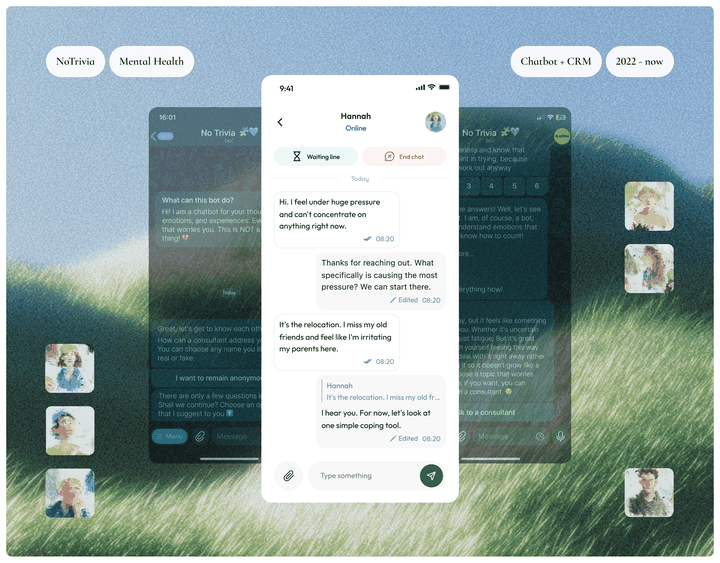 NoTrivia Chatbot+CRM - an assistant for Ukrainians that provides free mental health assistance through a Telegram chatbot, offering resources and connections to professional psychologists. Lionwood created a custom CRM and expanded the chatbot’s logic to handle more users...