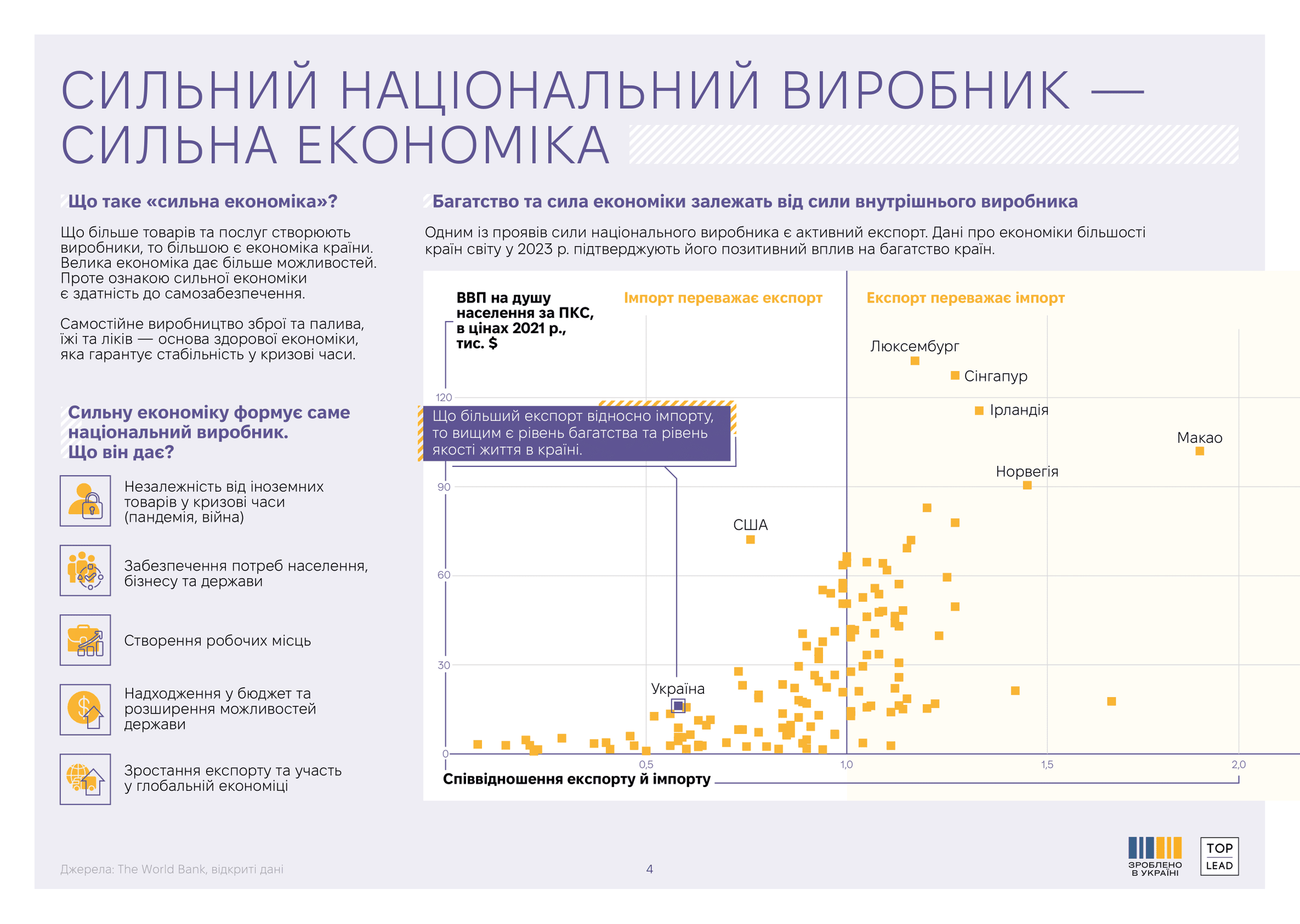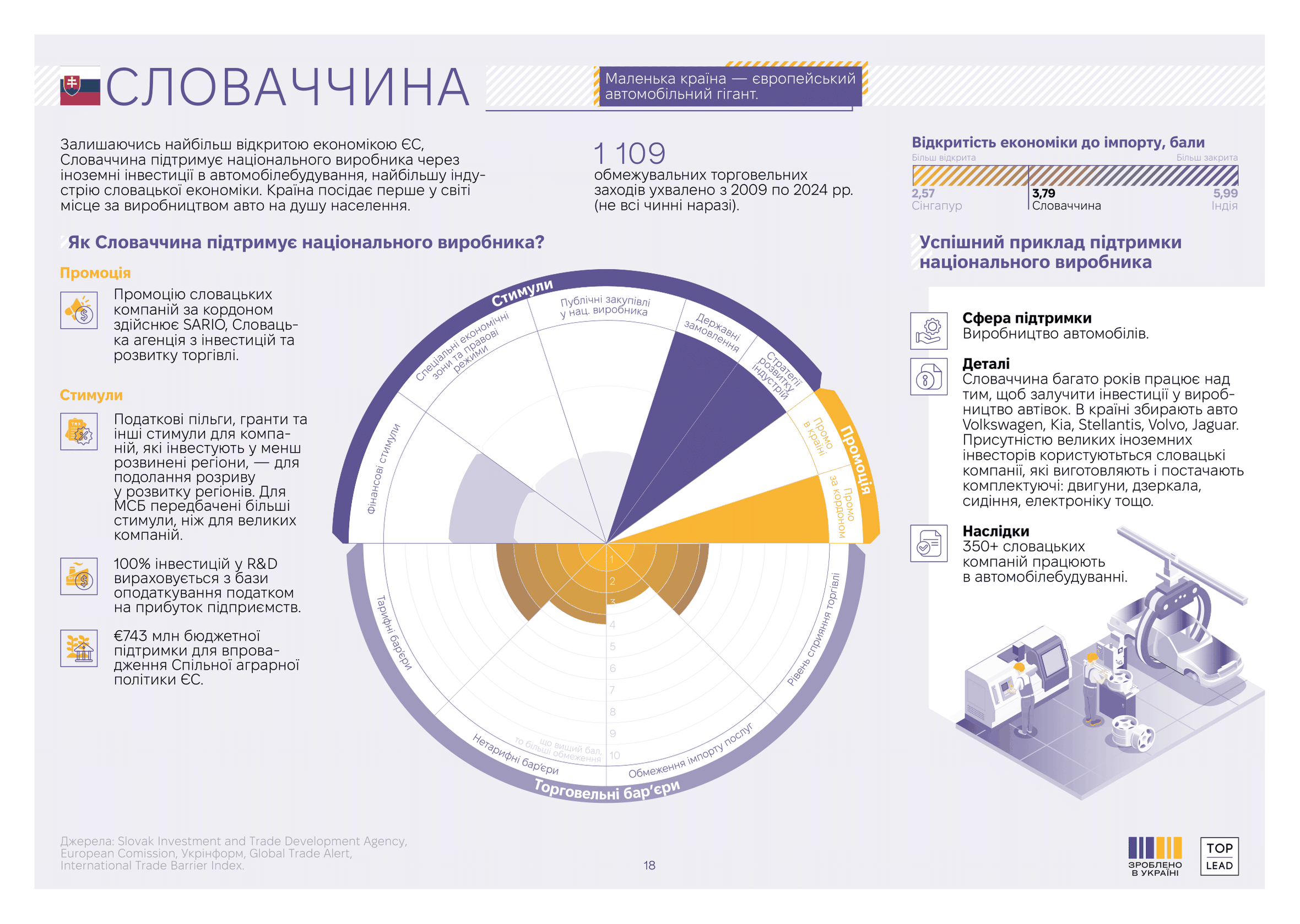 Дослідження про політики сприяння національному виробнику показує кейси різних країн та описує їх політику в цьому напрямі: підходи до економічних стимулів, промоції товарів нацвиробника та встановлення торговлених бар'єрів для товарів з інших країн.