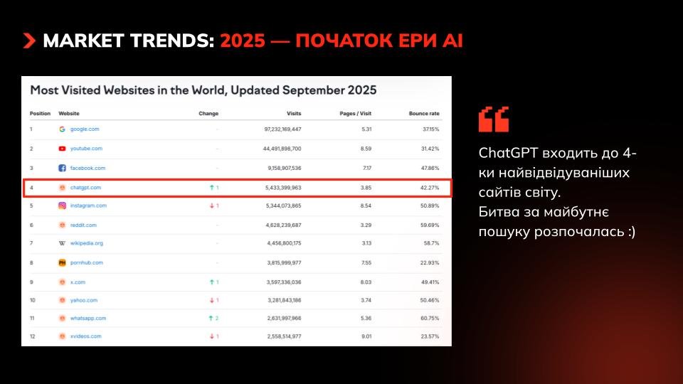 Новим центром уваги користувачів став ChatGPT. За останніми даними ця платформа увійшла у ТОП-4 найвідвідуваніших сайтів у світі. У вересні 2025 року ChatGPT отримав більше трафіку, ніж Reddit, Instagram або Вікіпедія.