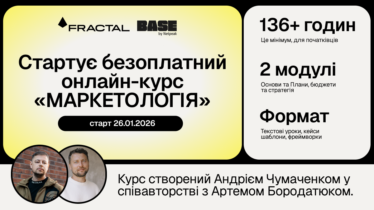 З 26 січня для навчання доступні перші два модулі з восьми — «Основи», «Плани, бюджети та стратегія». Курс створили українські підприємці з понад 20-річним досвідом у маркетингу — співзасновник Netpeak і засновник B2B-агенції BASE by Netpeak Андрій Чумаченко та засновник групи IT-компаній FRACTAL Артем Бородатюк.