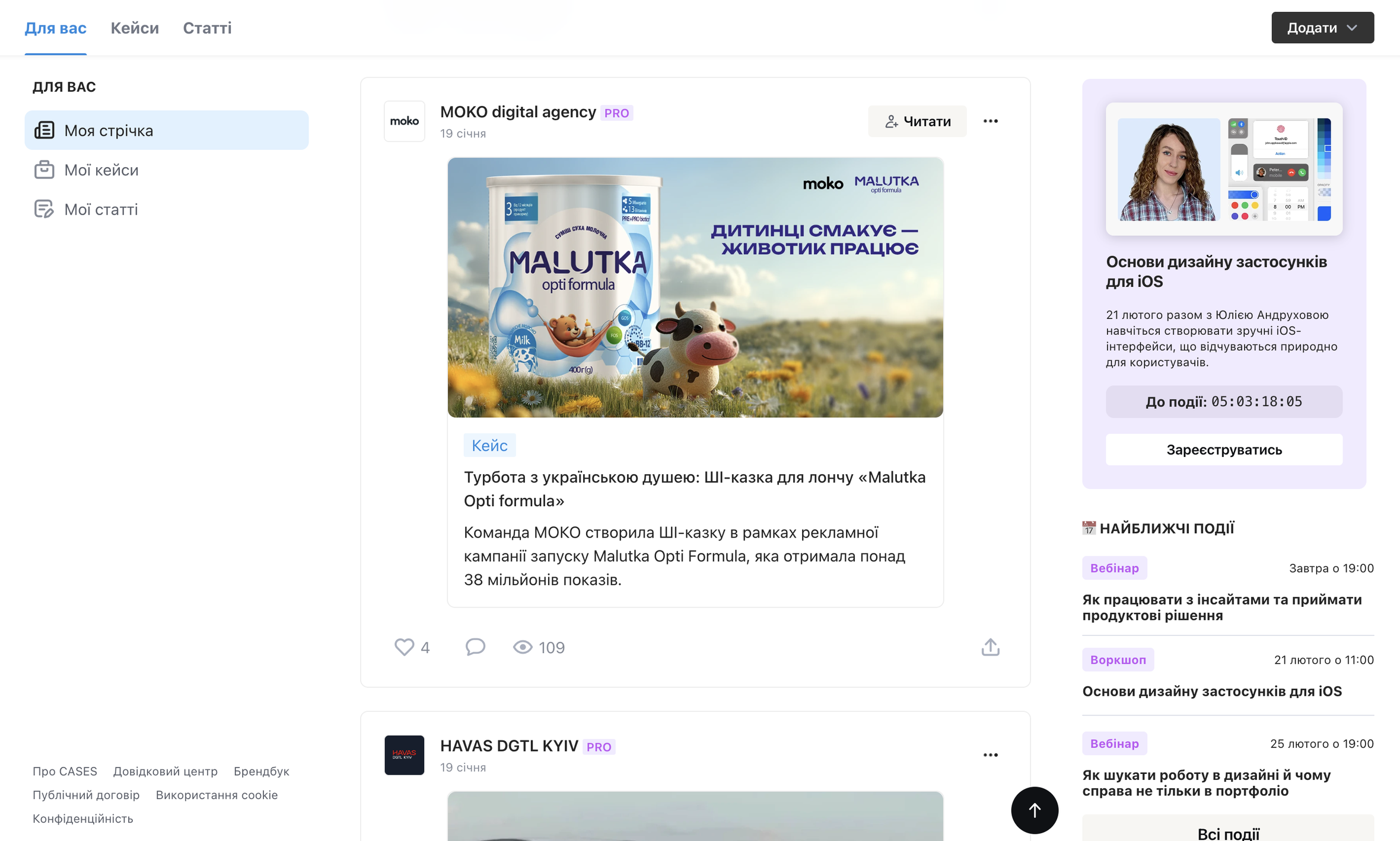 На CASES оновили вигляд стрічки — тепер вона виконана у новій дизайн-системі. Змінили порядок тексту опису матеріалу, кнопку «Підписатись» винесли у верхню частину картки, а «Просування матеріалу» перенесли в меню «Дії». Також додано низку візуальних покращень, виправлень і оптимізацій швидкодії.