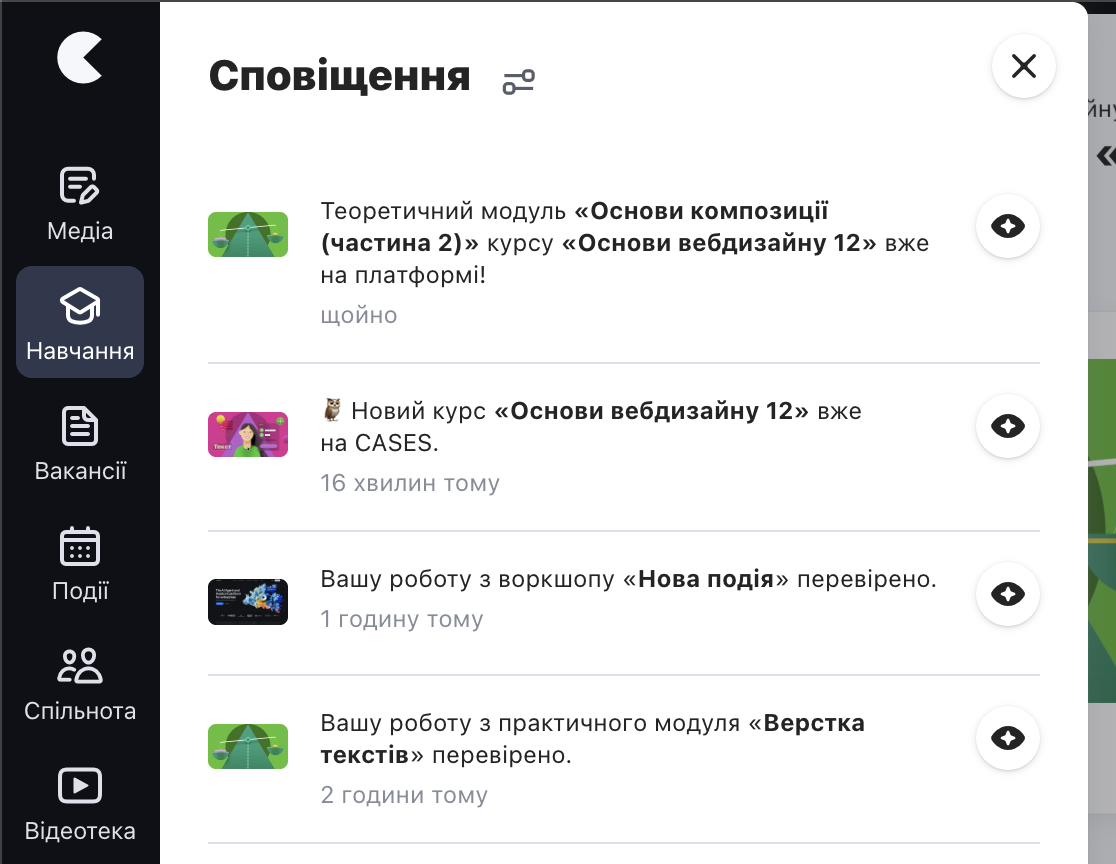 На CASES з’явився лічильник нових подій, що можуть бути цікавими користувачу, а сторінки подій отримали спливаючі підказки для кращої навігації. Також зʼявились нові системні сповіщення про перевірені практичні роботи й воркшопи, запуск курсів і релізи нових модулів.