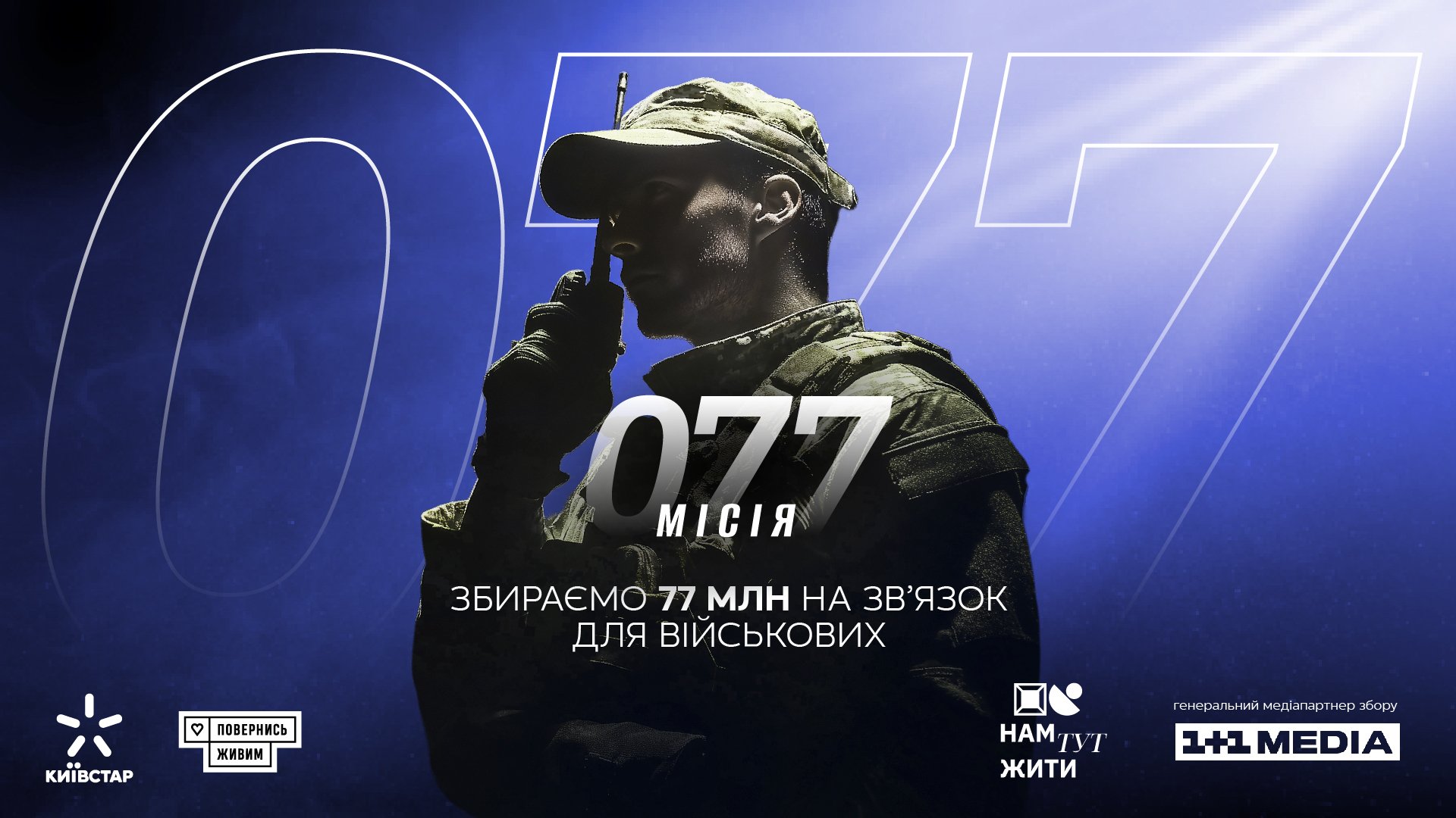 Компанія Київстар та Фонд «Повернись живим» запустили сьомий спільний проект підтримки армії — «Нам тут жити: Місія 077». Мета ініціативи — зібрати 77 гривень на зв’язок, щоб військові могли діяти більш злагоджено та ефективно. Ініціатива реалізується за інформаційної підтримки 1+1 Media.