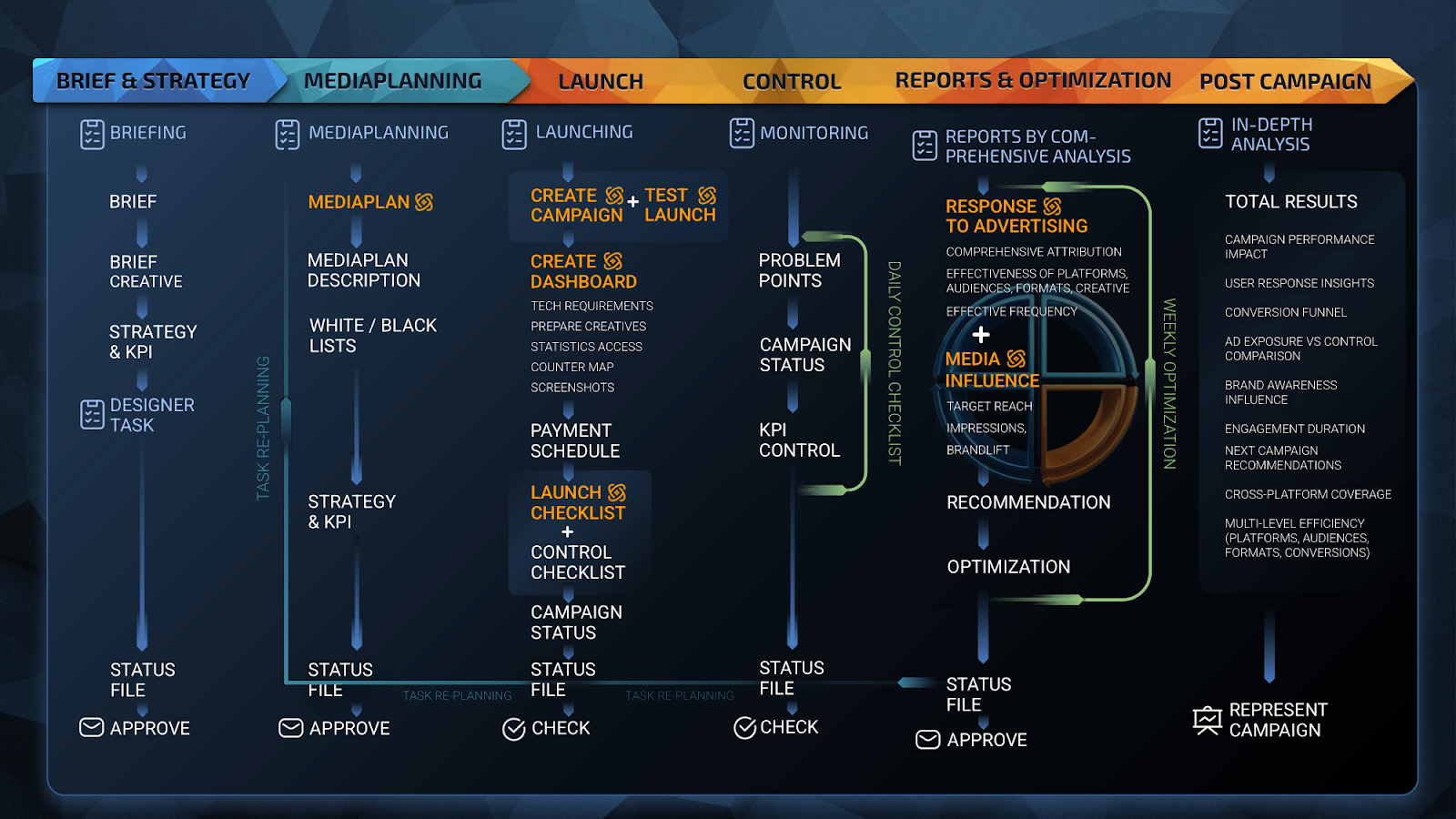 • Media Metrics — аналіз медійних показників і динаміки кампанії.