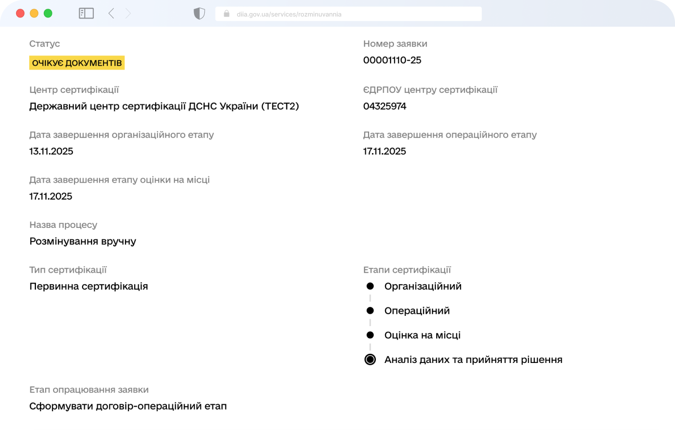 Зображення: Скрін послуги сертифікації оператора протимінної діяльності у Дії