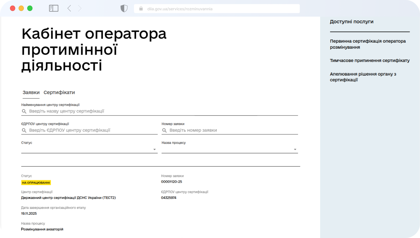 У кабінеті оператора протимінної діяльності можна подати заявку на первинну чи повторну сертифікацію, розширити сферу діяльності, продовжити дію сертифіката, пройти моніторинг відповідності, призупинити дію сертифіката або подати апеляцію щодо рішення органу сертифікації.