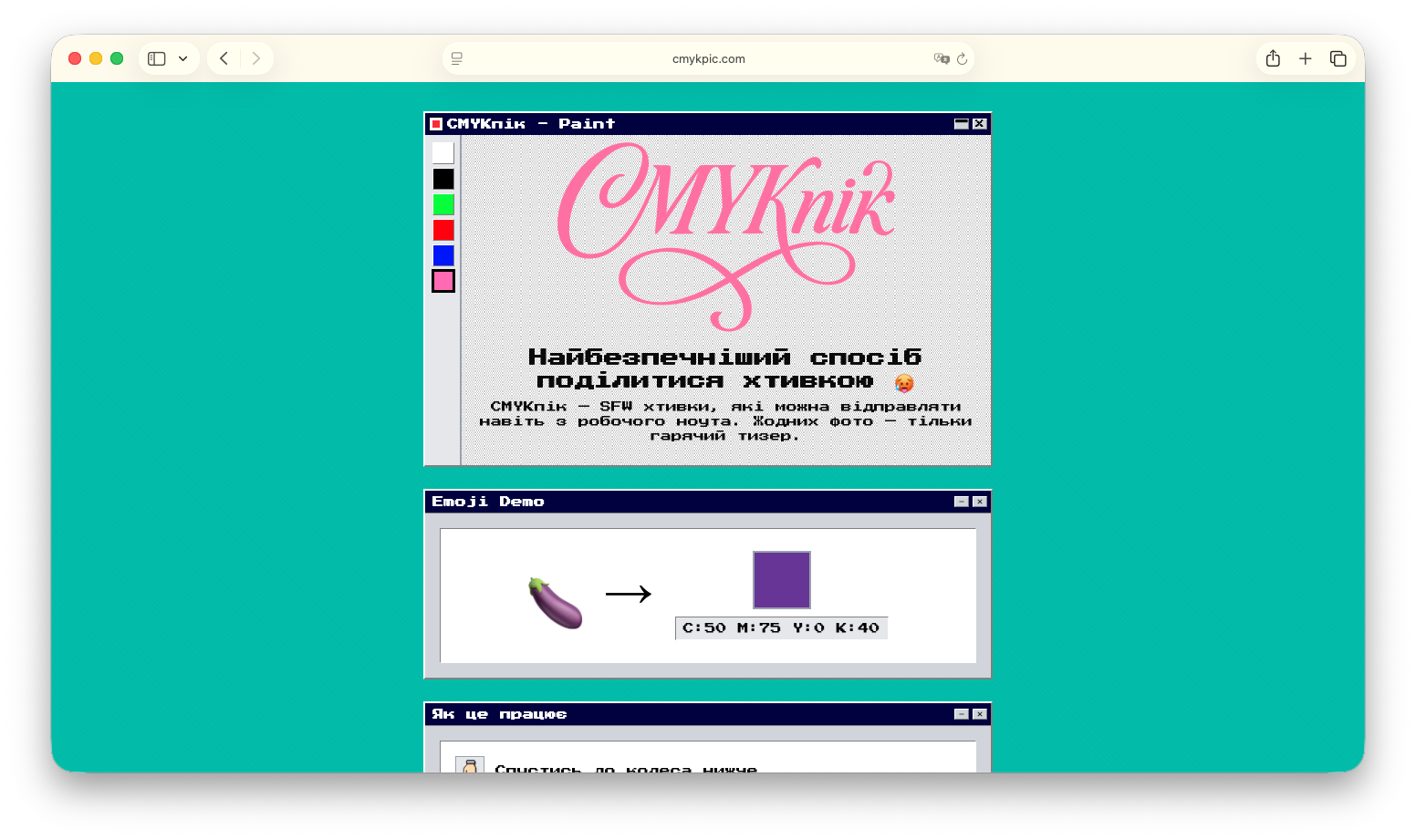 CMYKпік — це метажарт над інтимністю в інтернеті. Ми поєднали щось одночасно приватне та публічне. Тілесне й цифрове. Відверте й абстрактне.