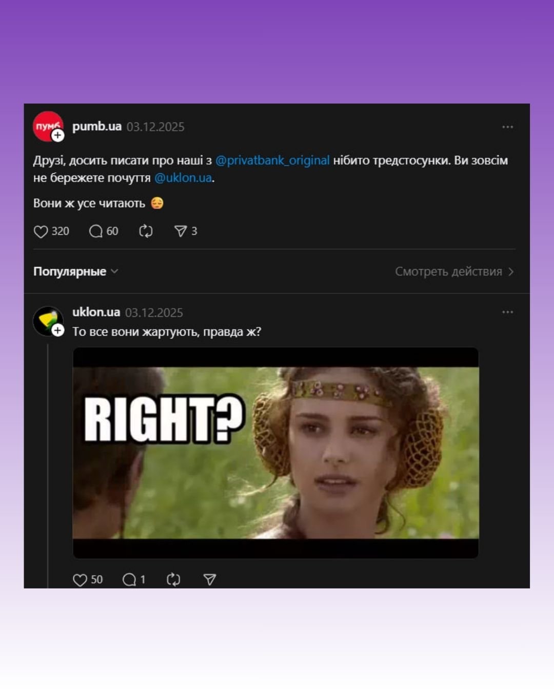 On Threads, companies joke around, use irony, respond to memes, tease competitors in the comments, and aren't afraid to laugh at their own mistakes. That's exactly what wins people over. When a brand speaks your language, gets the context, and doesn't try to look perfect, trust emerges. And with it—the desire to support, share, and come back. The casual style also becomes a way to stand out.