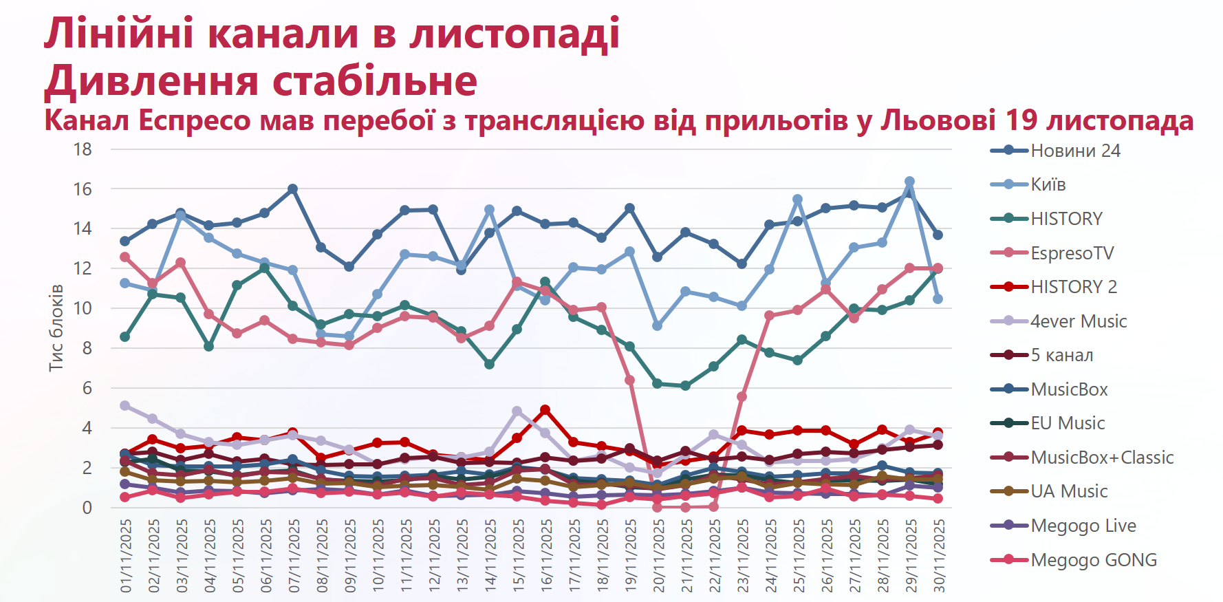 - Лінійні телеканали найдовше утримувались від значного падіння, а зі стабілізацією постачання електроенергії туди швидше почали повертатись телеглядачі.