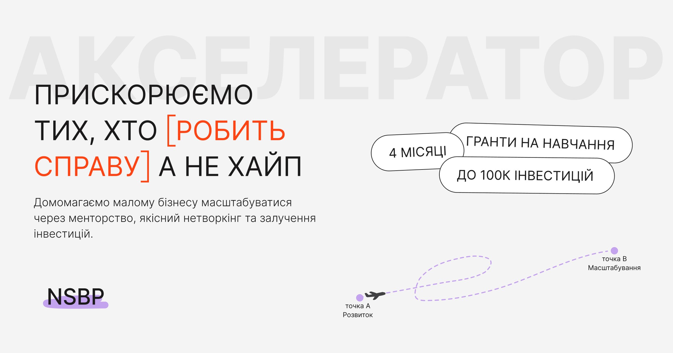 16 лютого українська платформи для розвитку малого підприємництва NSBP запускає бізнес-акселератор для підприємців, які мають оборот від $5 000 на місяць і хочуть системного масштабування та інвестицій. Програма надає можливість отримати стипендію на навчання (30-100%) та залучити інвестиції від янголів платформи.